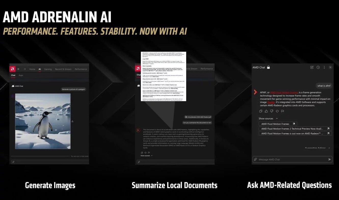 Nějaké AI funkce by se měly objevit i v ovladačích Radeonů, přesněji v nastavovací aplikaci AMD Software, pod označením „Adrenalin AI“. Zřejmě bude možné konverzovat se zabudovaným chatbotem (otázky k produktům AMD), nechat si sumarizovat dokumenty, ale také generovat obrázky. Jde tedy o podobné funkce, jako má aplikace Chat with RTX od Nvidie. Asi bude nutné mít do PC stažené náležité AI modely, takže toto patrně bude stát několik gigabajtů na systémovém SSD.