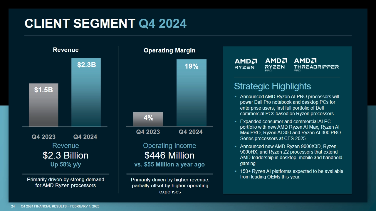 Menší proti datacentrovým CPU a GPU, která tvoří více než polovinu celkových tržeb, je prodej procesorů pro PC (segment Client). I tam ale došlo k důležitému růstu, tržby se meziročně zvýšily o 58 % na 2,313 miliardy $, což je nový rekord pro AMD. Znamená to, že AMD opět posiluje v procesorech pro PC, kde jeho tržní podíl a tržby na čas klesly poté, co se v roce 2022 výrobci PC ocitli po covidu ve stavu přezásobení a při „trávení“ zásob patrně více osekávali objednávky od AMD než objednávky čipů Intelu. Divize měla i slušný provozní zisk 446 milionů $ (provozní marže 19 %).