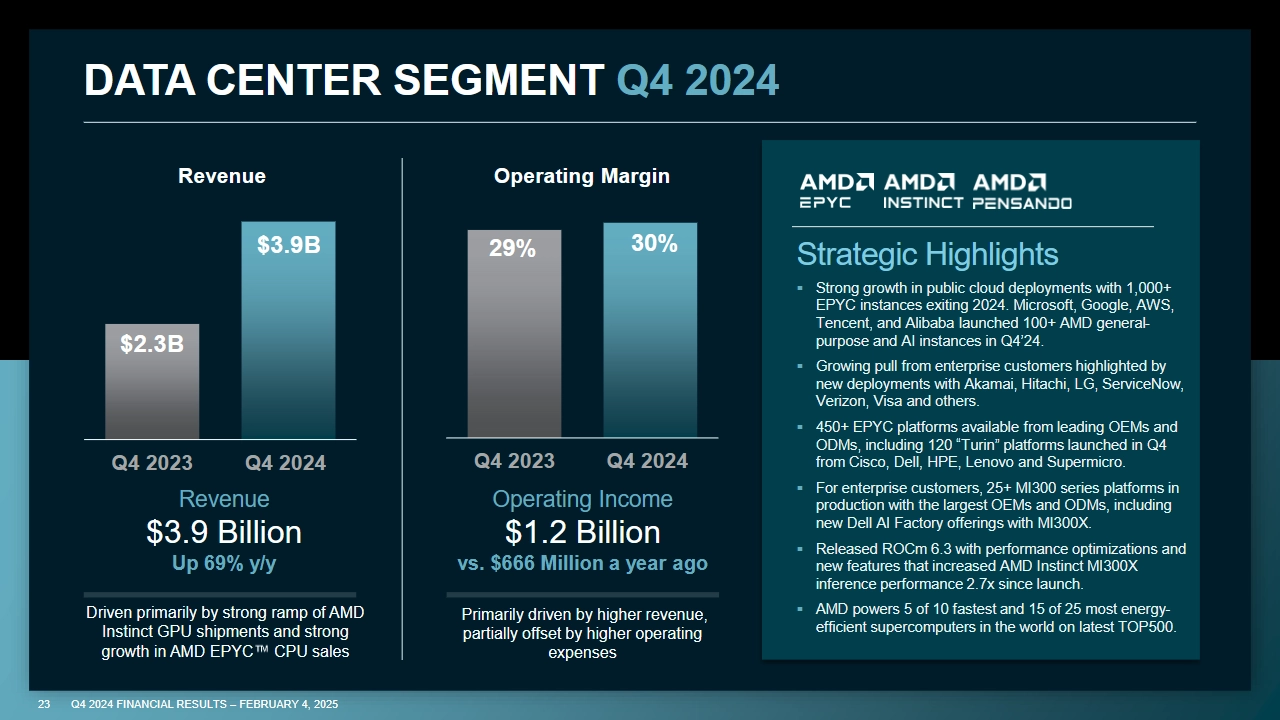 Největší úspěchy má teď AMD v segmentu serverů a datacentrových produktů, nejvíce díky AI akcelerátorům (GPU) Instinct, ale rostou také prodeje serverových procesorů Epyc. V Q4 byly tržby segmentu Data Center 3,859 miliardy $ (víc, než má Intel, mimochodem), což je 69% meziroční nárůst a rekordní výsledek firmy. Tento byznys dosáhl provozního zisku 1,157 miliardy $ při provozní marži 30 %.