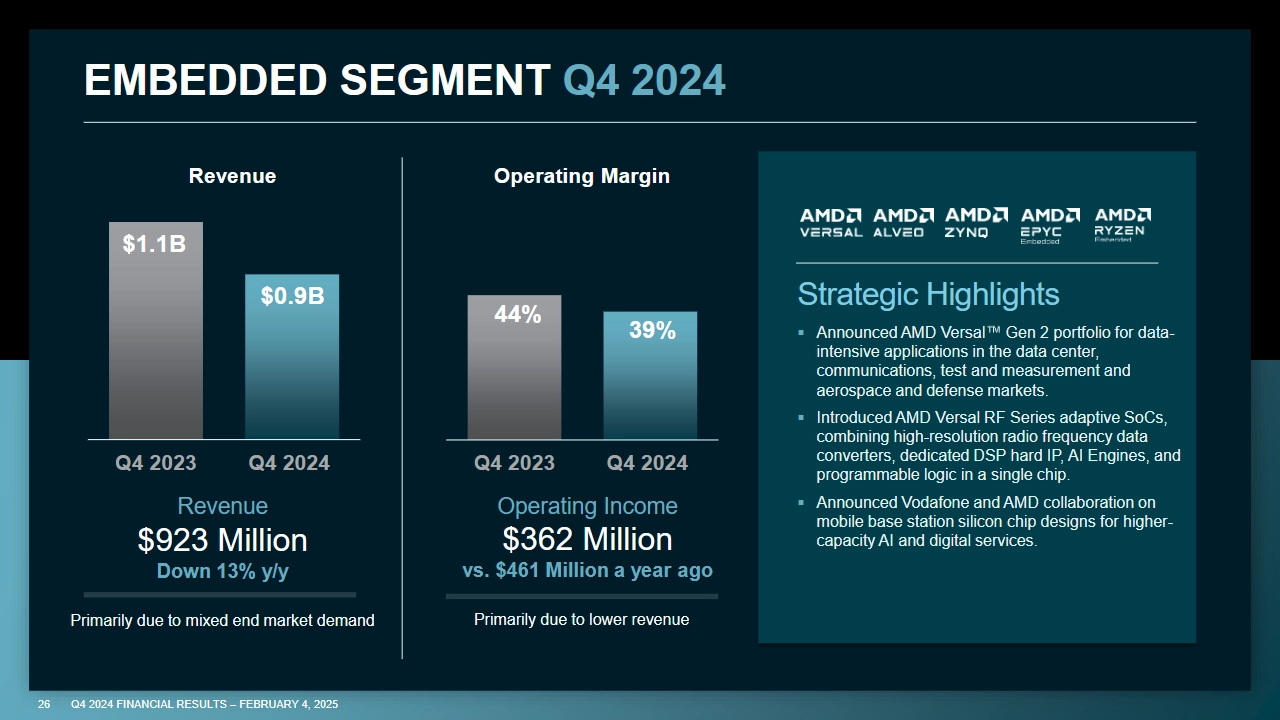 Segment Embedded měl tržby 923 milionů $ (meziročně pokles o 13 %), ale provozní zisk stále slušných 362 milionů $ (meziročně pokles o 21 %). Tyto produkty mají vysoké marže proti spotřebitelskému hardwaru, jde z převážné části o FPGA a další produkty Xilinxu – v Q4 2024 byla provozní marže 39 %, tedy ještě lepší než u datacentrových CPU a GPU.
