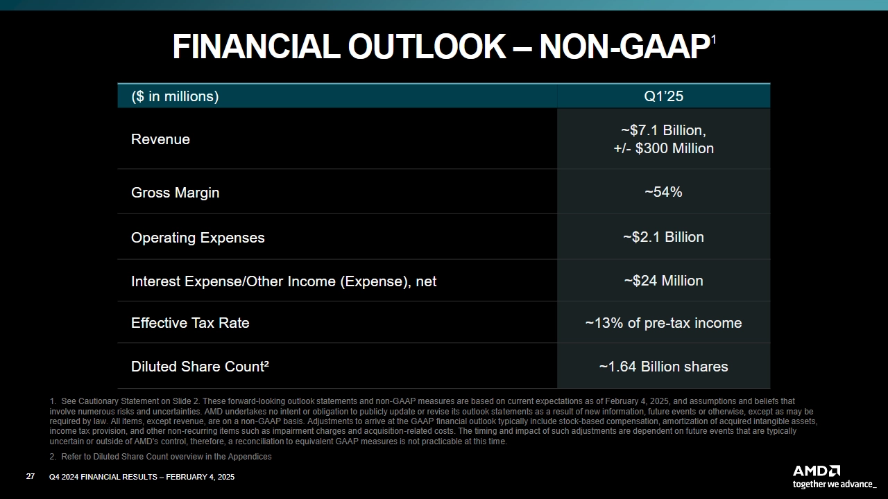 AMD zatím neuvádí prognózu na celý rok 2025, jen na první kvartál (Q1 2025). V tom očekává tržby okolo 7,1 miliardy $ (s obvyklou tolerancí plus minus 300 milionů). Pokud by tedy realita opět byla o podobný kousíček nad jako nyní, byly by tržby někde u 7,2 miliardy $, a byly by tedy mezikvartálně nižší. To je ale asi vliv běžné sezónnosti, v Q1 2024 mělo AMD tržby 5,473 miliardy, mezikvartálně o 11 % nižší proti Q4 2023. Proti tehdejšímu výsledku by předpokládané tržby v nynějším Q1 2025 meziročně vycházely lepší o 31–32 %.