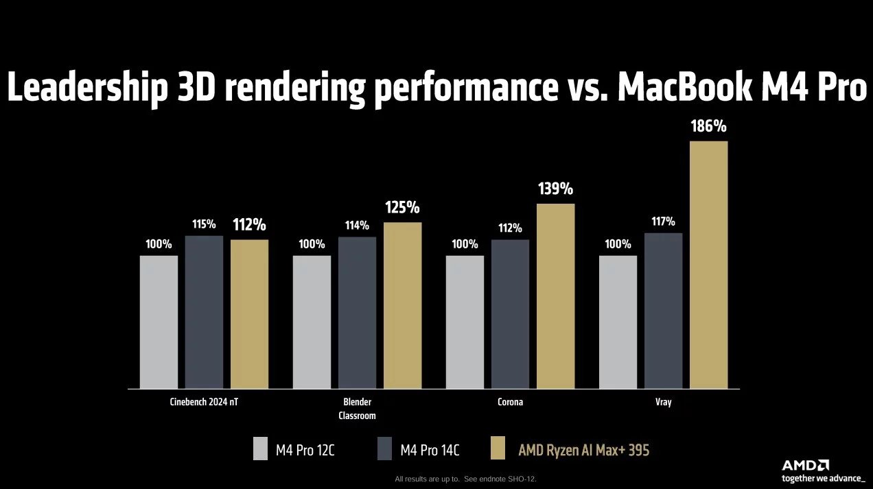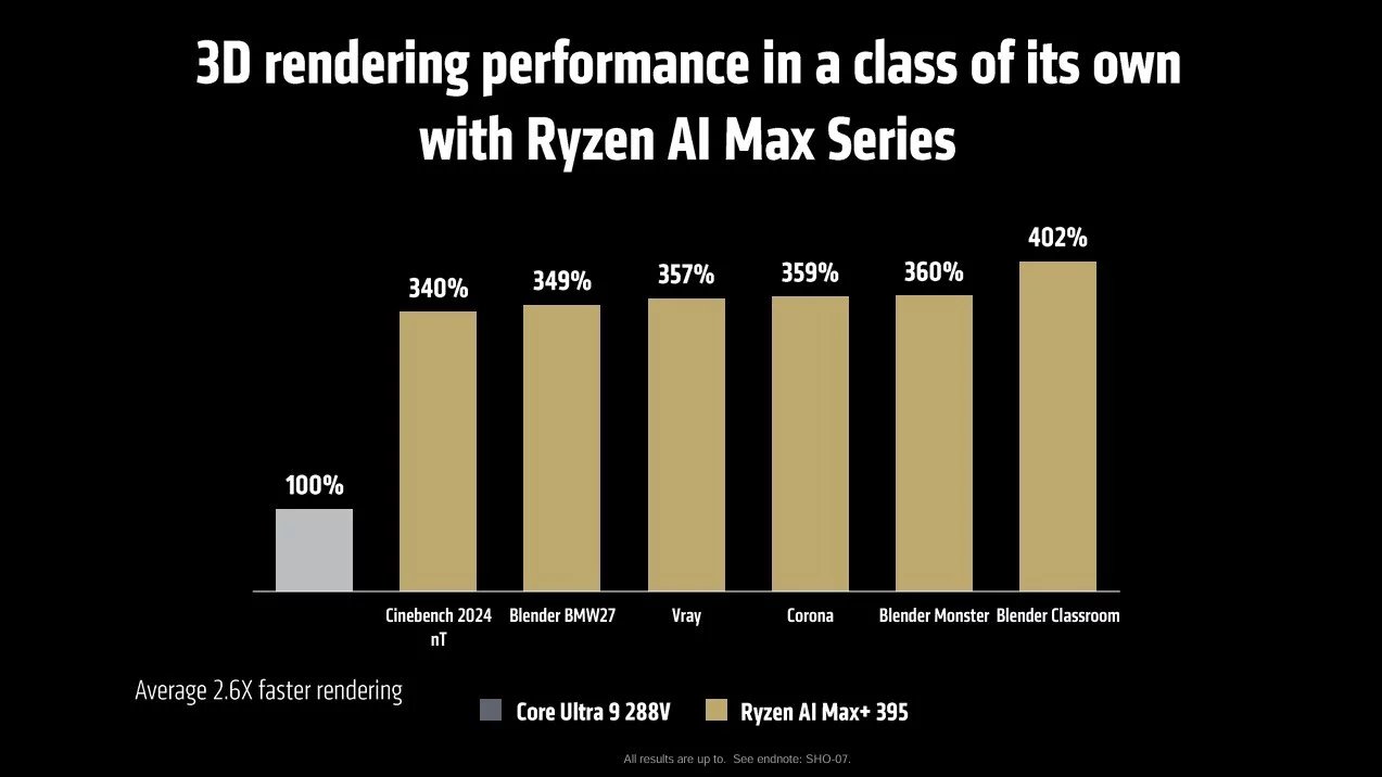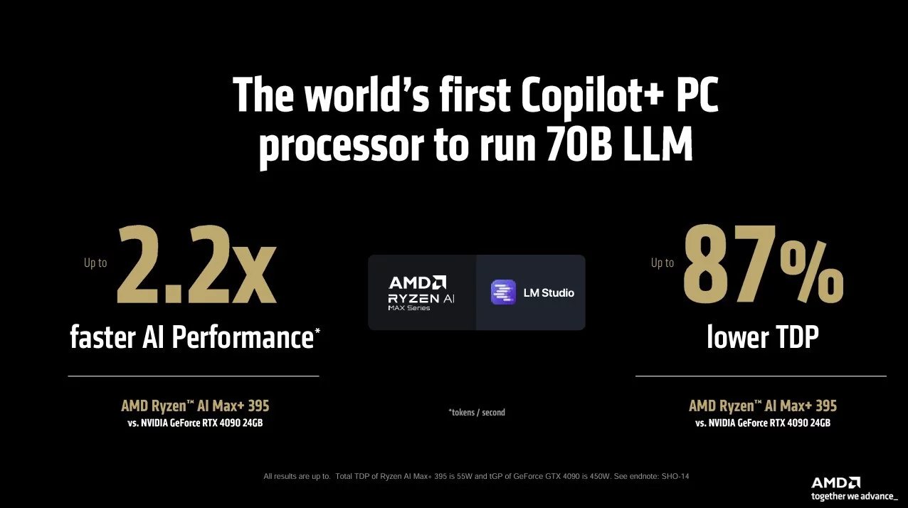 AMD například uvádí, že na Ryzenu AI Max bude možné spustit LLM umělou inteligenci s modelem o 70 miliardách parametrů a rozdíl daný kapacitou paměti způsobí, že bude relativně útlé mobilní GPU schopné pracovat s až 2,2× výkonem (v tokenech za sekundu) proti desktopové GeForce RTX 4090 (protože ta bude výrazně limitovaná svou jen 24GB pamětí). Je to přitom při výrazně nižším TDP (55 W proti 450 W, takže AMD mluví o 87% nižším TDP – ale toto srovnání spotřeby je hodně speciální případ, který nelze nijak zobecňovat).