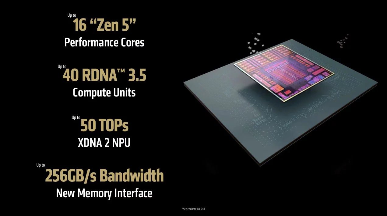 Základem procesoru jsou dva 4nm čiplety s celkem 16 jádry / 32 vlákny architektury Zen 5, které pravděpodobně jsou převzaté z desktopových Ryzenů 9000 (dva čiplety po osmi jádrech a 32 MB L3 cache). Měly by to tedy být všechno velká jádra, nikoliv Zen 5c, a také mít plný výkon instrukcí AVX-512 s nativně 512bitovými jednotkami, na rozdíl od menšího APU Strix Point.