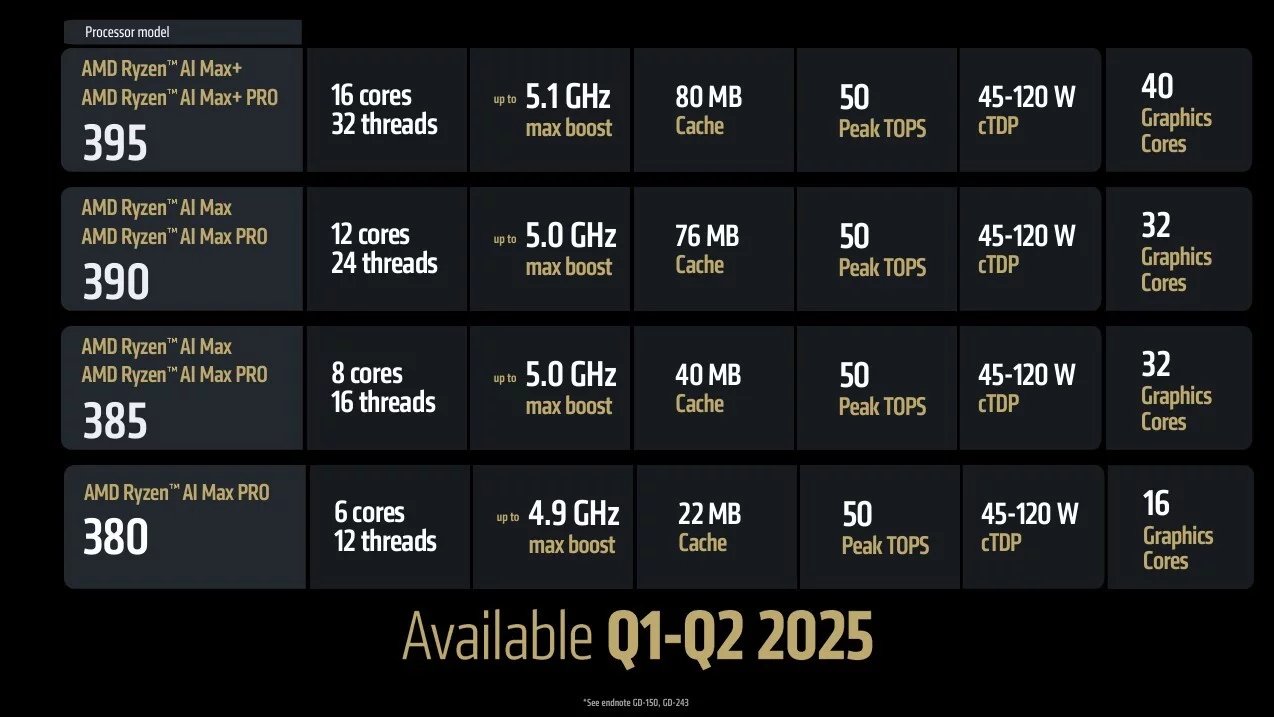 Zmiňovali jsme specifikace plné verze Strix Halo, reálně ale bude prodávaných víc modelů. Maximální výkon bude nabízet Ryzen AI Max+ 395. Ten má plných 16 jader / 32 vláken architektury Zen 5 plus 64 MB L3 cache (ve dvou 32MB segmentech). Základní takt je 3,0 GHz a maximální boost 5,1 GHz. Tento model má nejvýkonnější variantu GPU Radeon 8060S. Má plných 2560 shaderů (40 CU) a takt boostu až 2900 MHz. Tento procesor má i „Pro“ variantu Ryzen AI Max+ Pro 395. Parametry jsou stejné, ale budou k dispozici funkce AMD Pro určené pro business notebooky a pracovní stanice, tedy různé bezpečnostní funkce, schopnosti vzdálené správy, šifrování paměti a podobně.