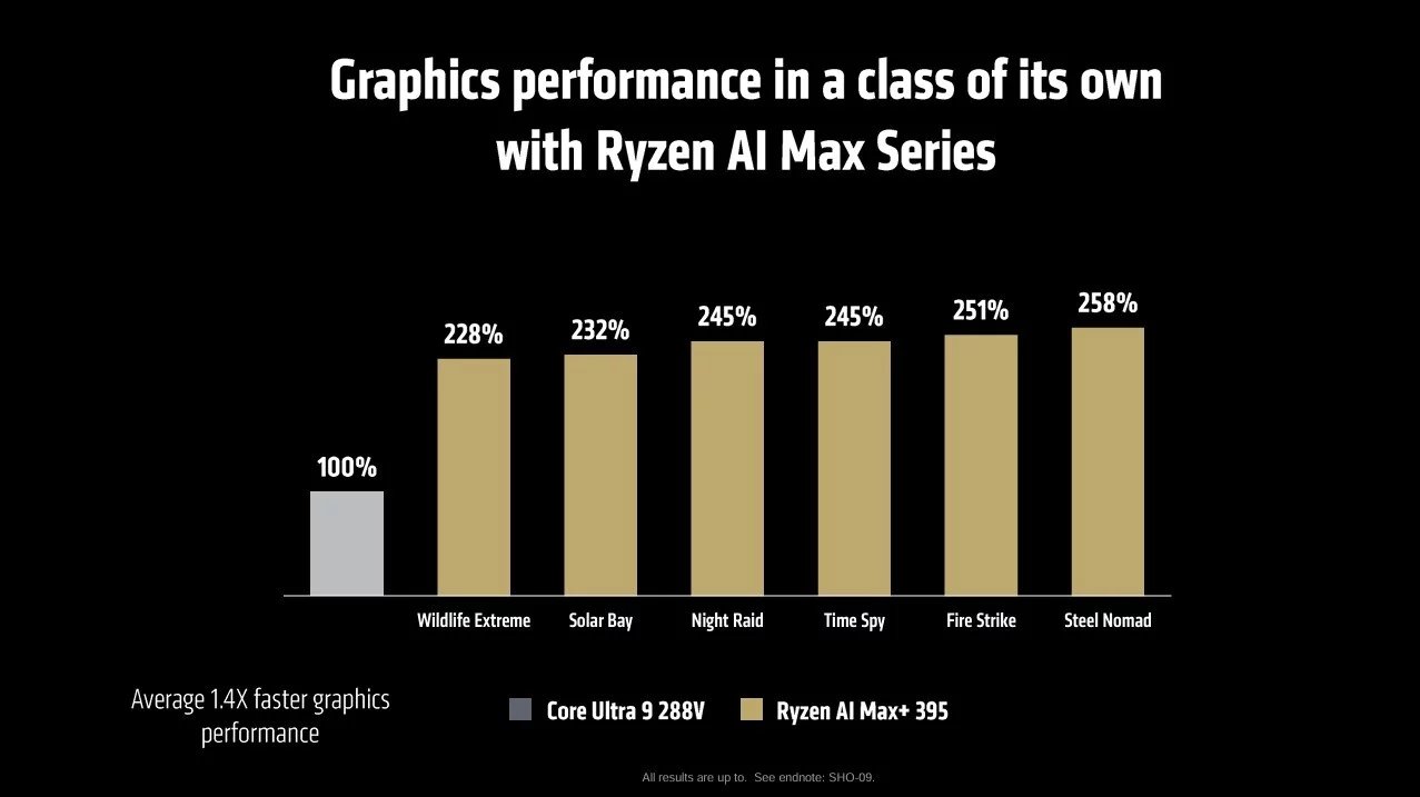 Oficiální benchmarky integrované grafiky proti procesoru Intel Lunar Lake (který je vybaven nejlepším konkurenčním integrovaným GPU, jde ale o čip spotřebou patřící do nižší kategorie než Strix Halo). Další oficiální benchmarky najdete v titulní galerii na začátku článku