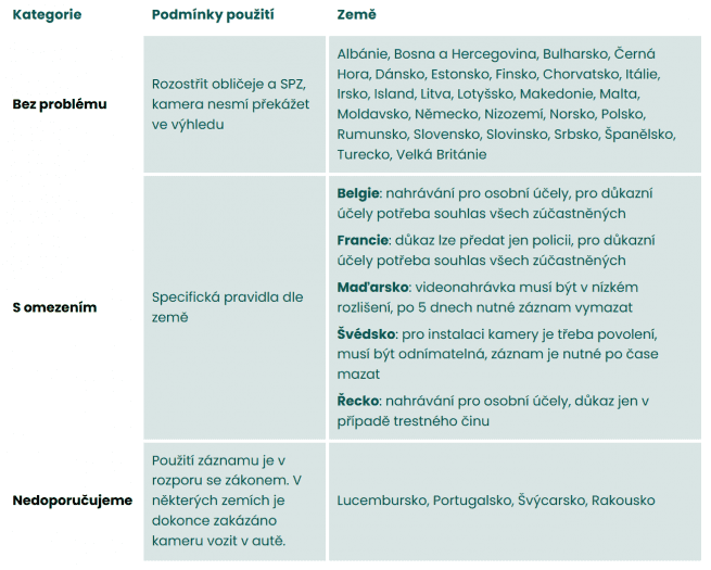 Právě v čase dovolených je ale důležité si na závěr připomenout, že v některých zemích vás může používání palubní kamery v autě dostat do potíží. V České republice i na Slovensku je používání kamer v autě legální a například v Německu, Chorvatsku či Itálii nejsou podmínky použití autokamer nastavené nijak přísně. Musíte pouze respektovat místní pravidla ochrany soukromí a při šíření záznamu rozmazat tváře i SPZ.