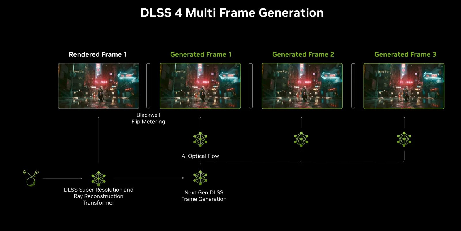 Zdá se, že hlavní novou „technologií“ u GeForce RTX 5000 je DLSS 4. O jeho příchodu se už vědělo, ale nebylo jasné, co přinese. Zdá se, že jádrem je rozšíření techniky generování snímků z DLSS 3. Ta doteď přidávala jeden interpolovaný (umělý, nepravý) mezisnímek mezi každé dva reálně vykreslené snímky hry, tedy jinými sloty 50 % snímků bylo reálných, 50 % uměle dointerpolovaných. O tom, jak generování snímků probíhá a jaké to má výhody či nevýhody, jsme psali zde: