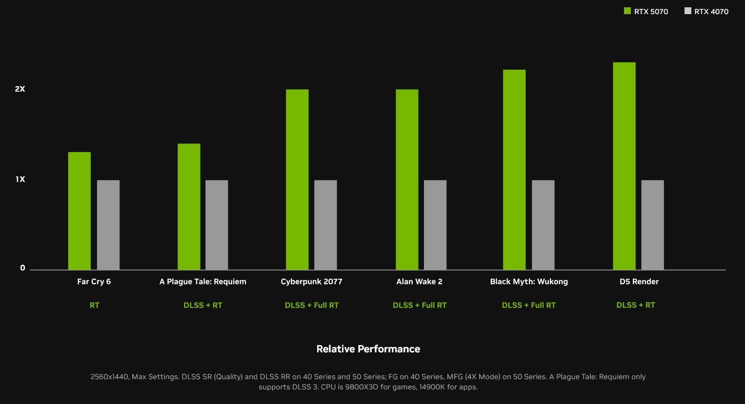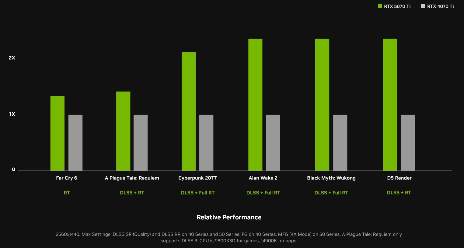 Pokud jde o výkon, Nvidia zase tvrdí, že má být karta 2× rychlejší než RTX 4070 Ti (spoiler: zase je to uděláno pomocí DLSS 4). Reálně to podle grafů vypadá, že je karta o +33 % rychlejší ve Far Cry 6 s ray tracingem a o +42 % rychlejší v A Plague Tale: Requiem (RT + DLSS3).