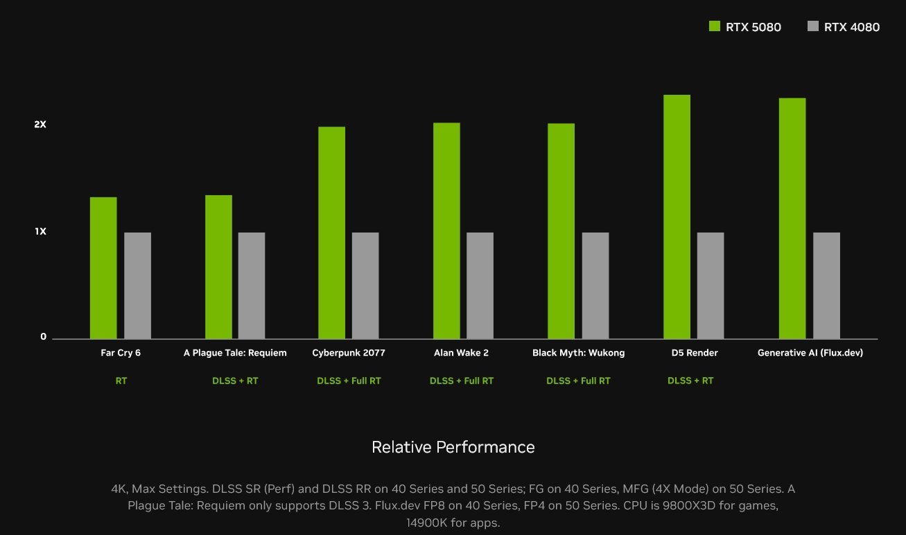 Podle grafů to vypadá, že GeForce RTX 5080 by měla proti RTX 4080 být o +33 % rychlejší ve Far Cry 6 s ray tracingem a o +36 % rychlejší v A Plague Tale: Requiem (RT + DLSS3). Opět to je s určitou nepřesností, protože nemáme přímo čísla. A samozřejmě nevíme, zda jde o reprezentativní hry, nebo zda Nvidia nevybírala takové, kdy vypadá zvlášť dobře. Firma opět ve svých materiálech tvrdí, že výkon je dvojnásobný, ale opět je číslo zkreslené skrze DLSS 4.