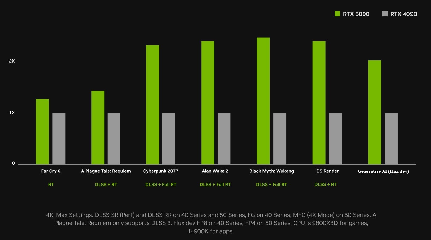 V těch druhých hrách by se měl ukazovat skutečný rozdíl ve výkonu, oficiální grafy ho ale trochu znejasňují tím, že sloupce nejsou popsané. Počítáním pixelů se zdá, že GeForce RTX 5090 má být asi o +27 % (plus minus nějaké procento) rychlejší než RTX 4090 ve hře Far Cry 6 s ray tracingem a o +42 % lepší ve hře A Plague Tale: Requiem s ray tracingem. Ta už má ale započítaný i efekt DLSS3. Výkon v nějaké neraytracingové hře Nvidia neuvádí.