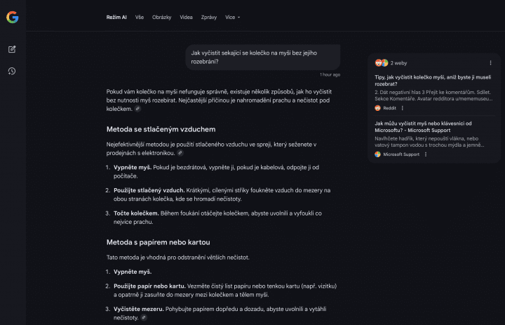 Chcete-li použít AI mode pro vyhledávání, na webu Googlu je potřeba kliknout na Režim AI, nikoliv stisknout Enter. Ten totiž odkáže na běžnou vyhledávací stránku a na vyhledávání s využitím AI bude potřeba se překliknout v horní liště. To stejné platí o (pravděpodobně nejčastější) situaci, kdy se uživatel dostane na Google z adresního řádku.