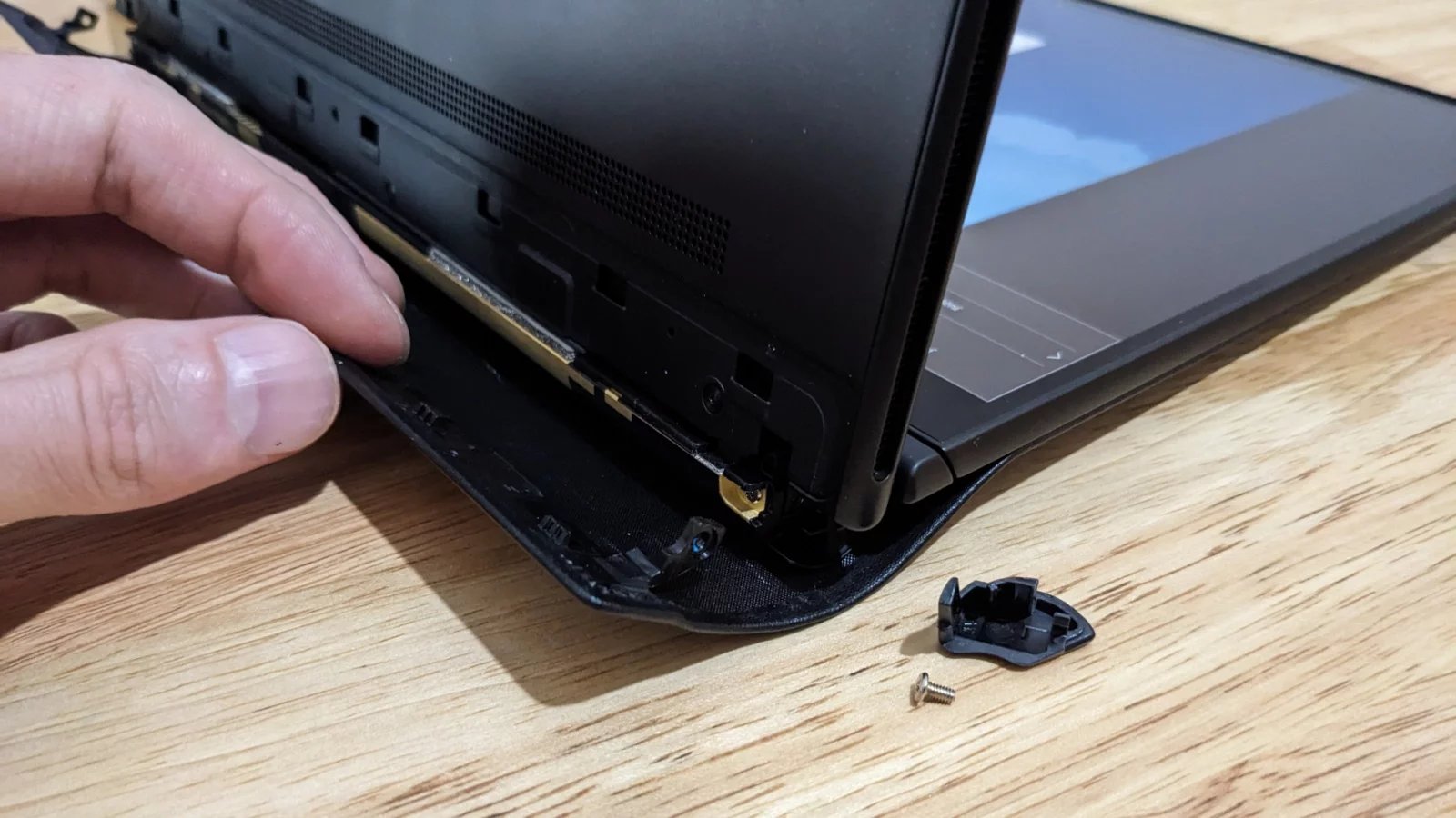 Dostat se k hardwaru tohoto kousku je docela oříšek. Nejprve musíte odcvaknout dvě záslepky na bocích kloubu a vyšroubovat odsud dva šrouby. Tady je lepší se inspirovat na videu přímo od HP.