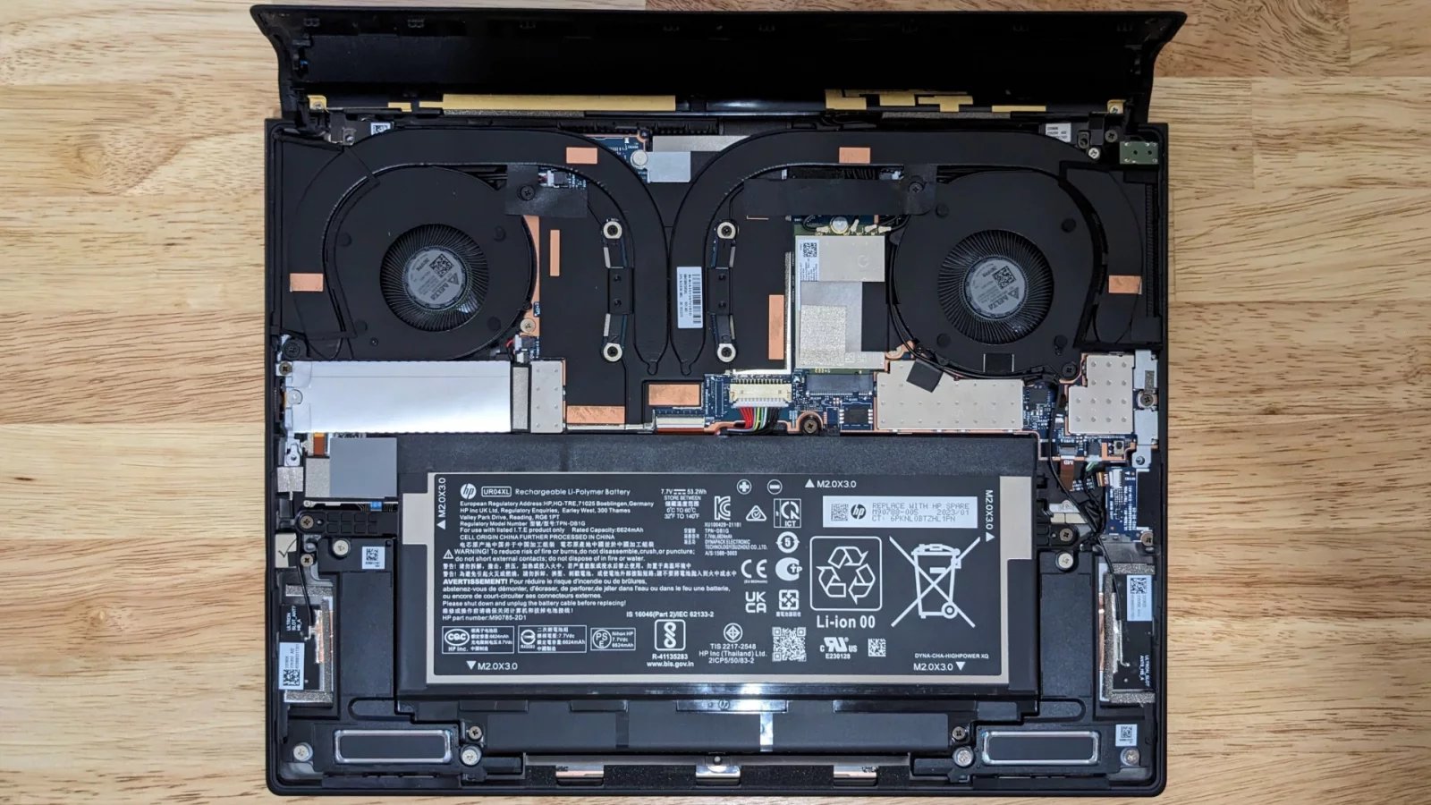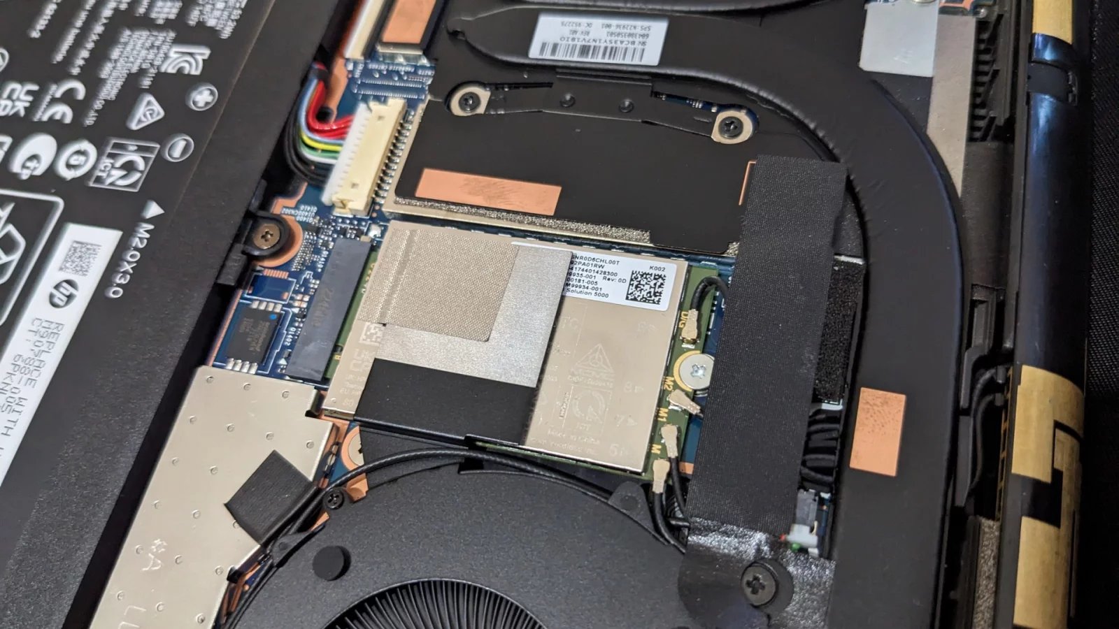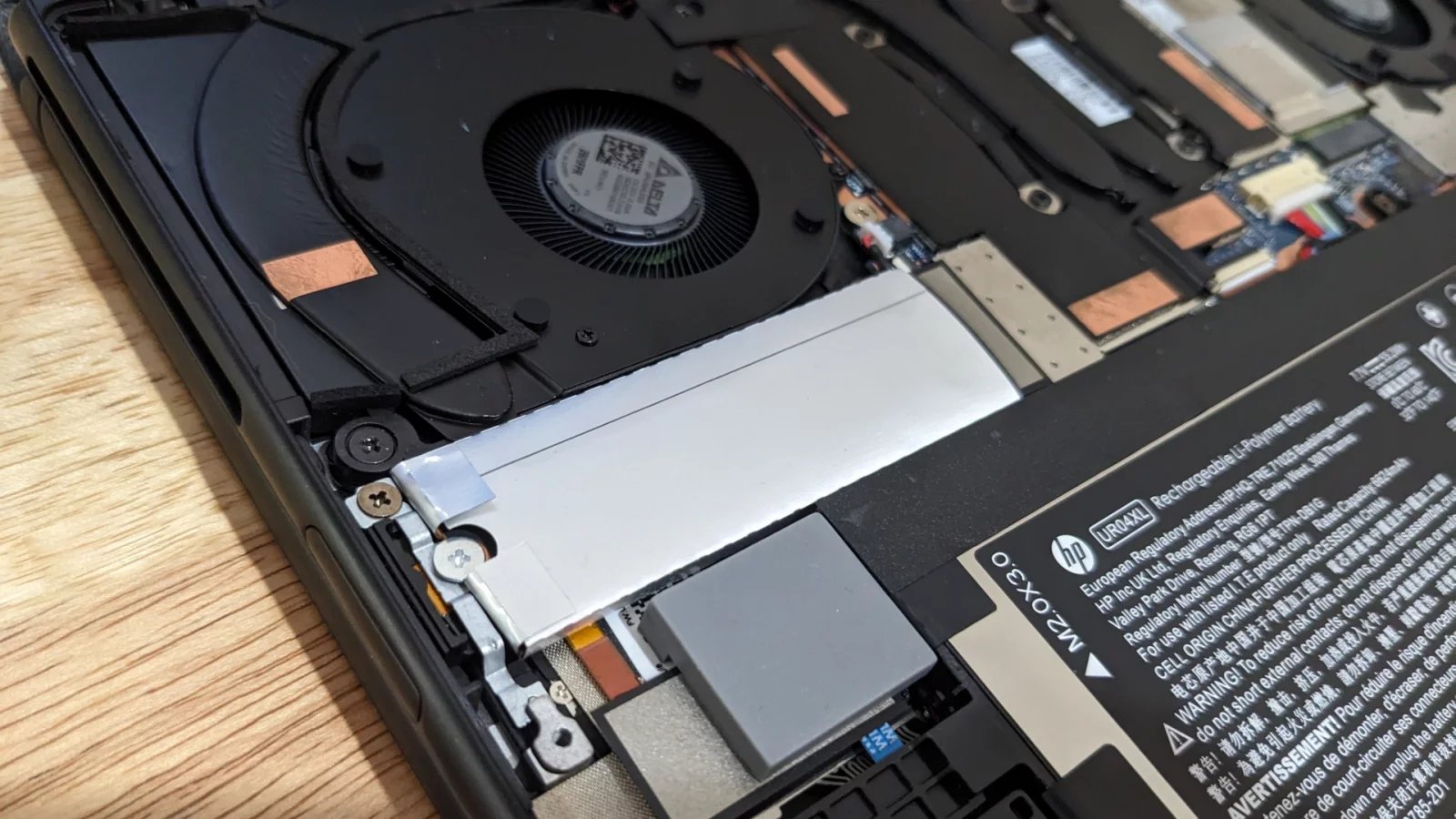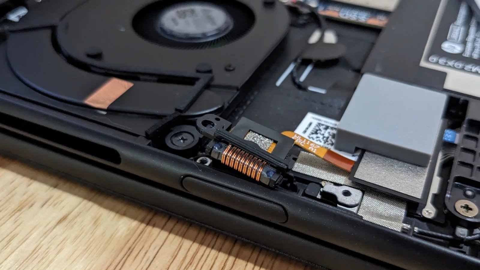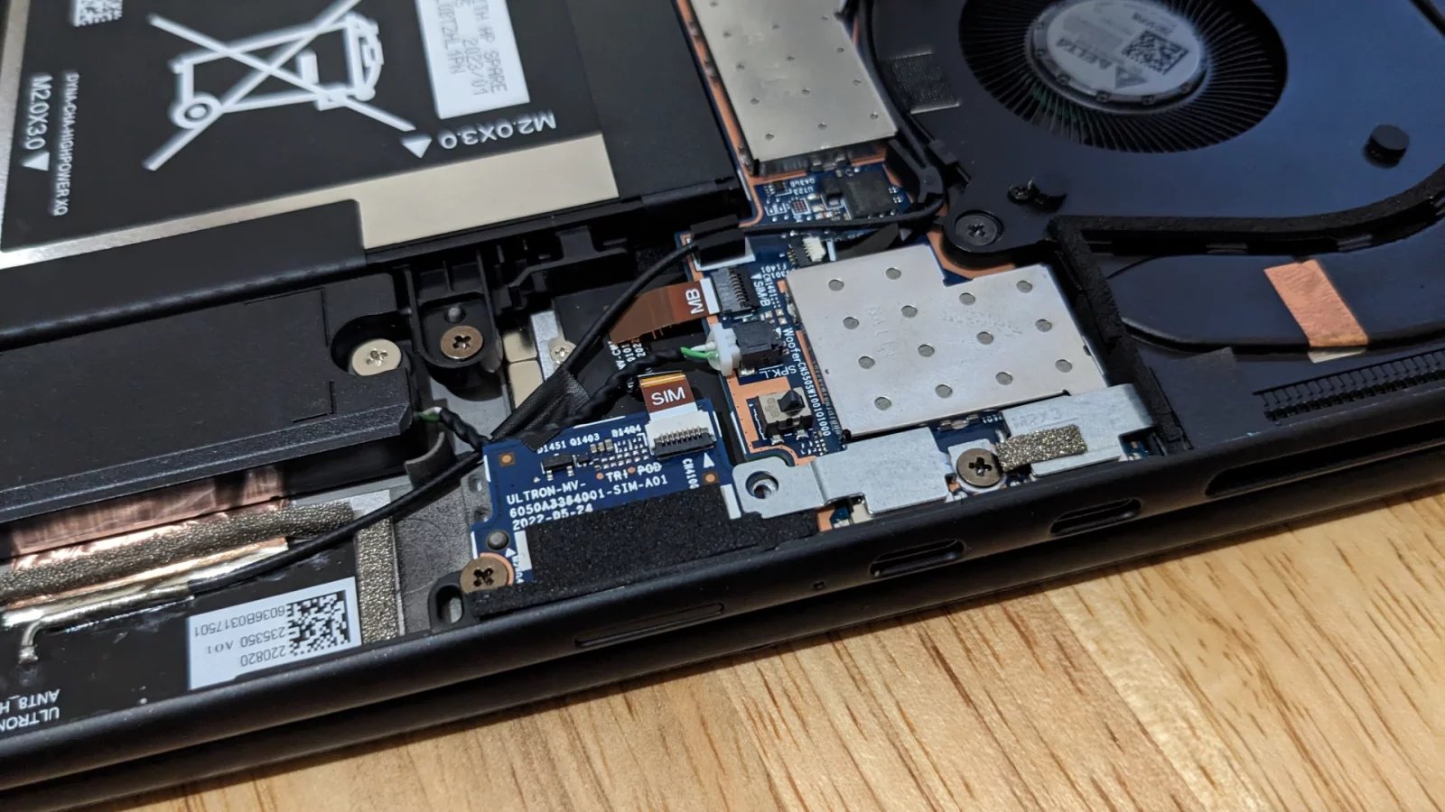 Uvnitř je vidět dvouokruhové chlazení, každé s jednou heatpipe. Přístup tu je k disku SSD (zde 512GB od Micronu) a modulu 5G. Paměti jsou na desce napájené napevno.