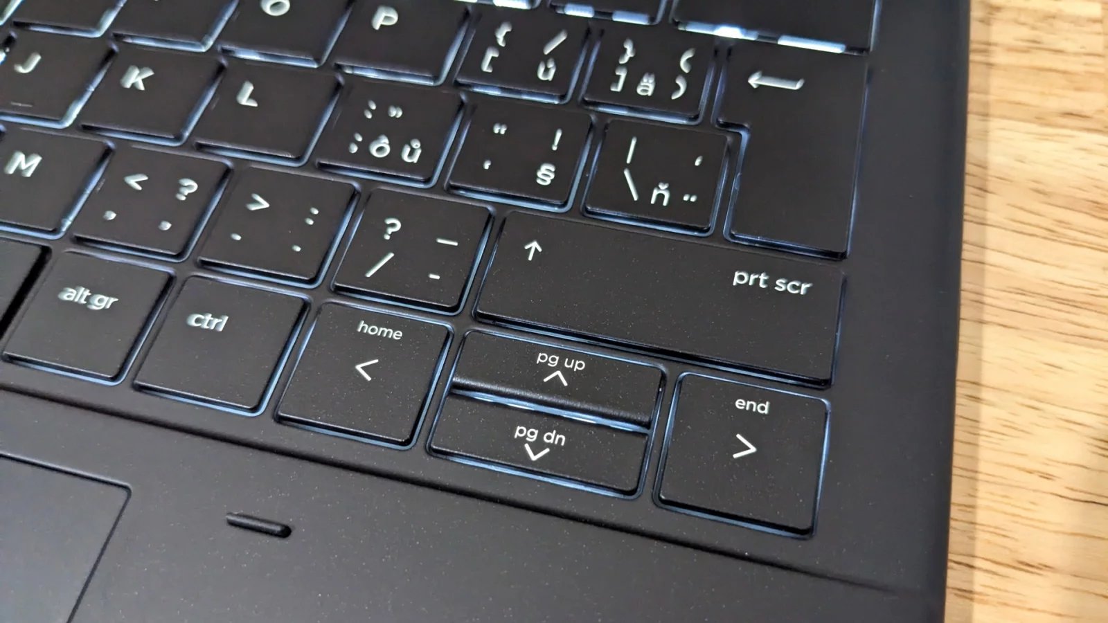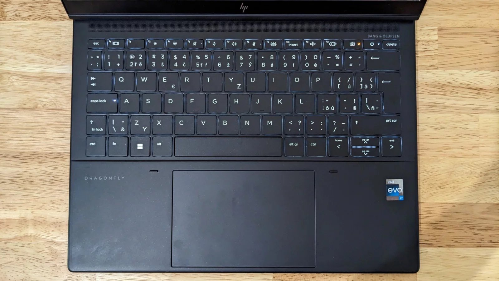 Klávesnice je typu ISO, má české znaky a bílé podsvícení. To se aktivuje i jen přejetím prstu po touchpadu. Zdvih kláves je poměrně nízký, ale celkově se píše dobře. Klasicky nepovedené jsou u HP kurzorové šipky, ty umí HP už jen u herních modelů. Všude už osazuje jen tuto velmi neergonomickou variantu. Zkratka Alt+F4 pro zavření okna u HP funguje naštěstí v obou režimech Fn, většina výrobců tohle neumí.