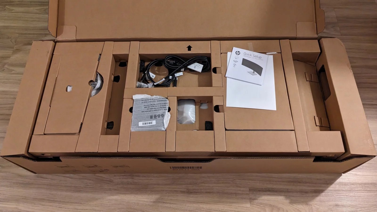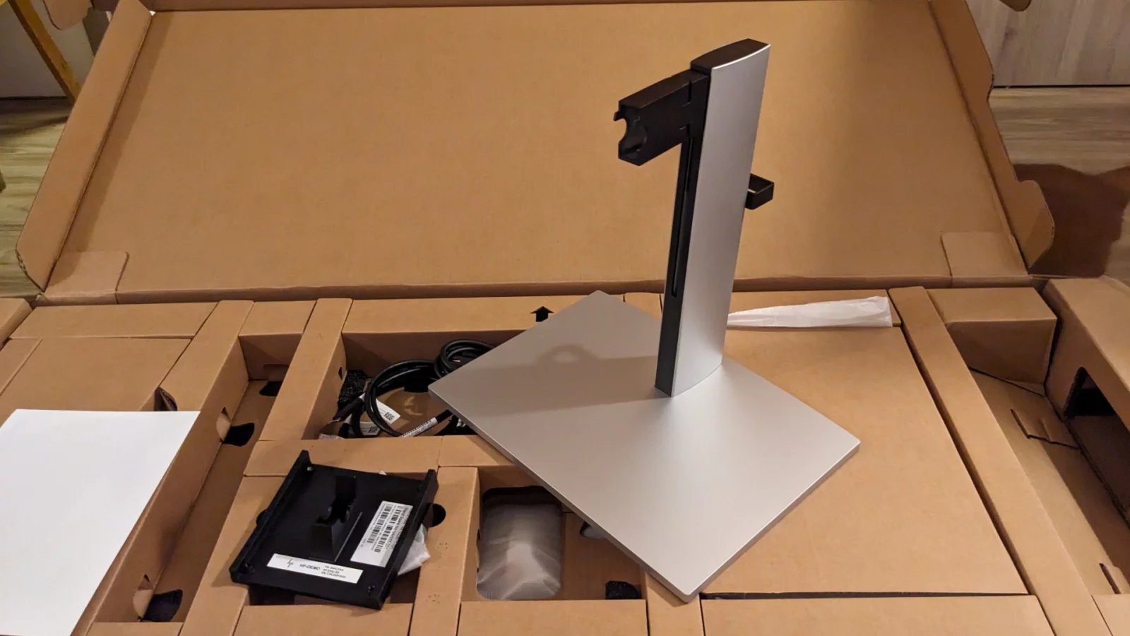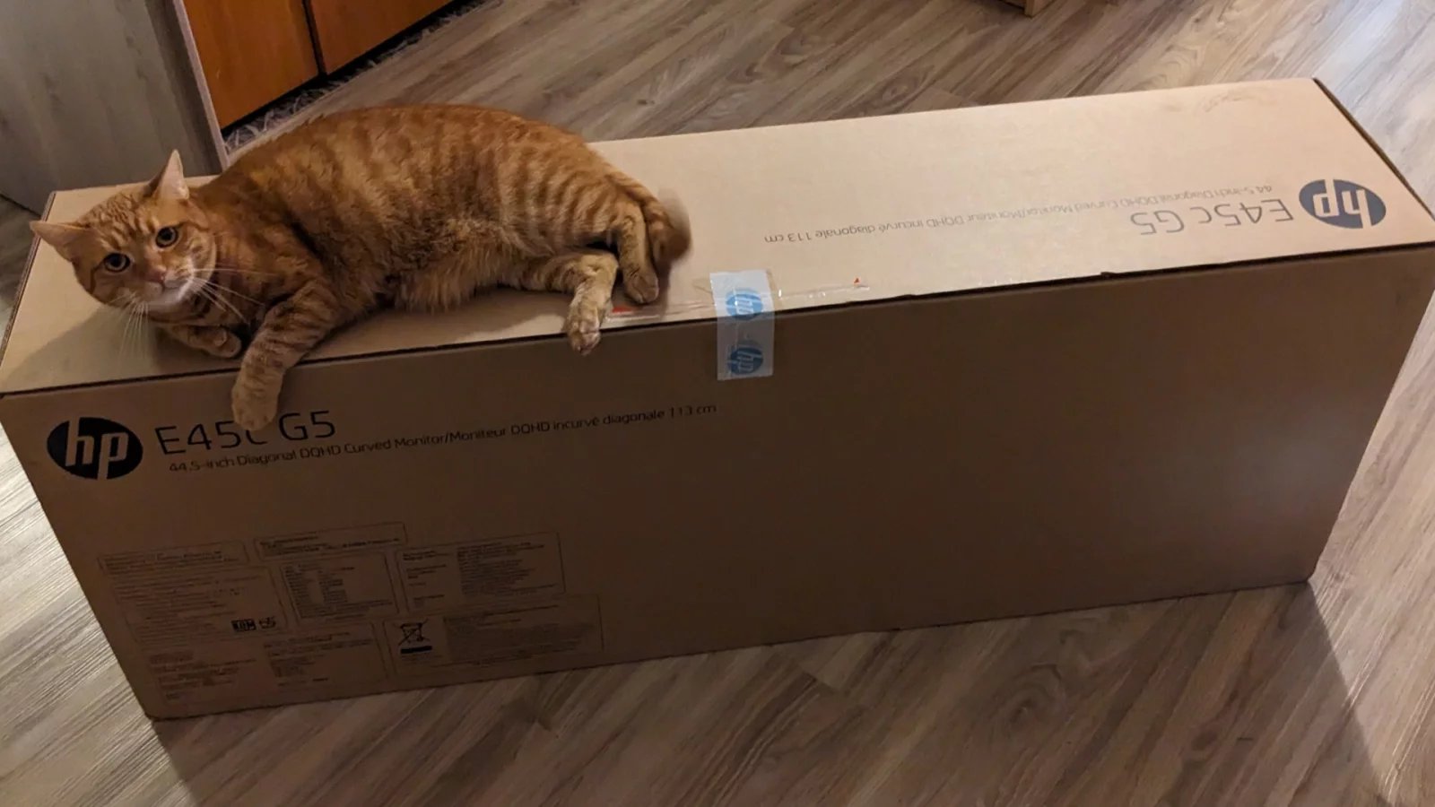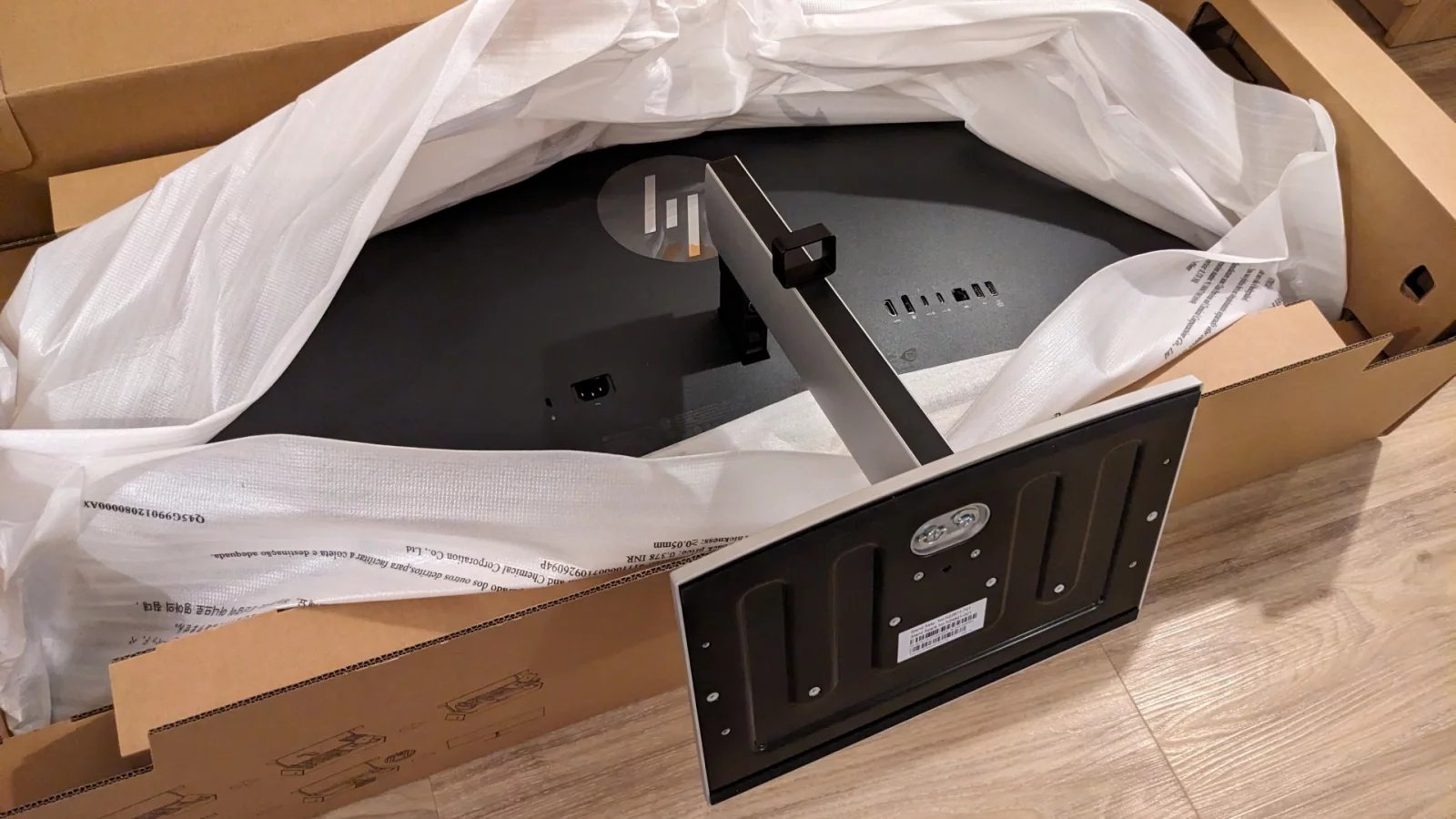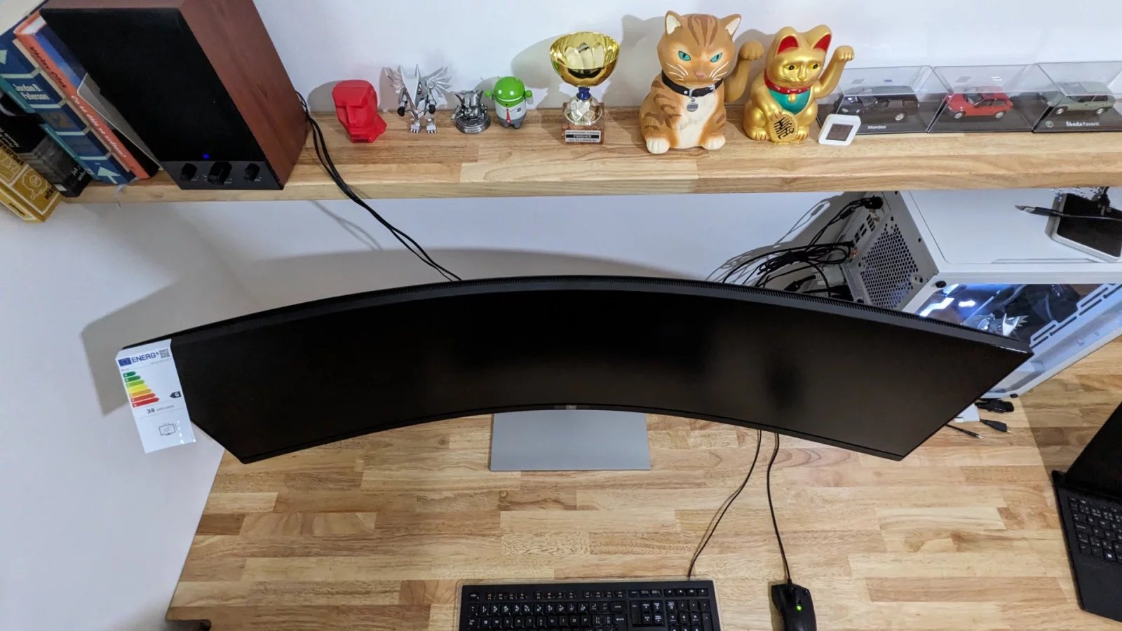 Široký panel typu VA má úhlopříčku 5120 × 1440 px (DQHD) a úhlopříčku 44,5". Na šířku je to 109 cm (změřte si, jestli se vám vůbec vejde na stůl), zato na výšku jen 33,5 cm. Vybalení i takto velké potvory je nakonec velmi jednoduché a zvládnete ji v jednom člověku. Základnu přišroubujete rukou, celý stojan se na monitor jen nacvakne a drží.