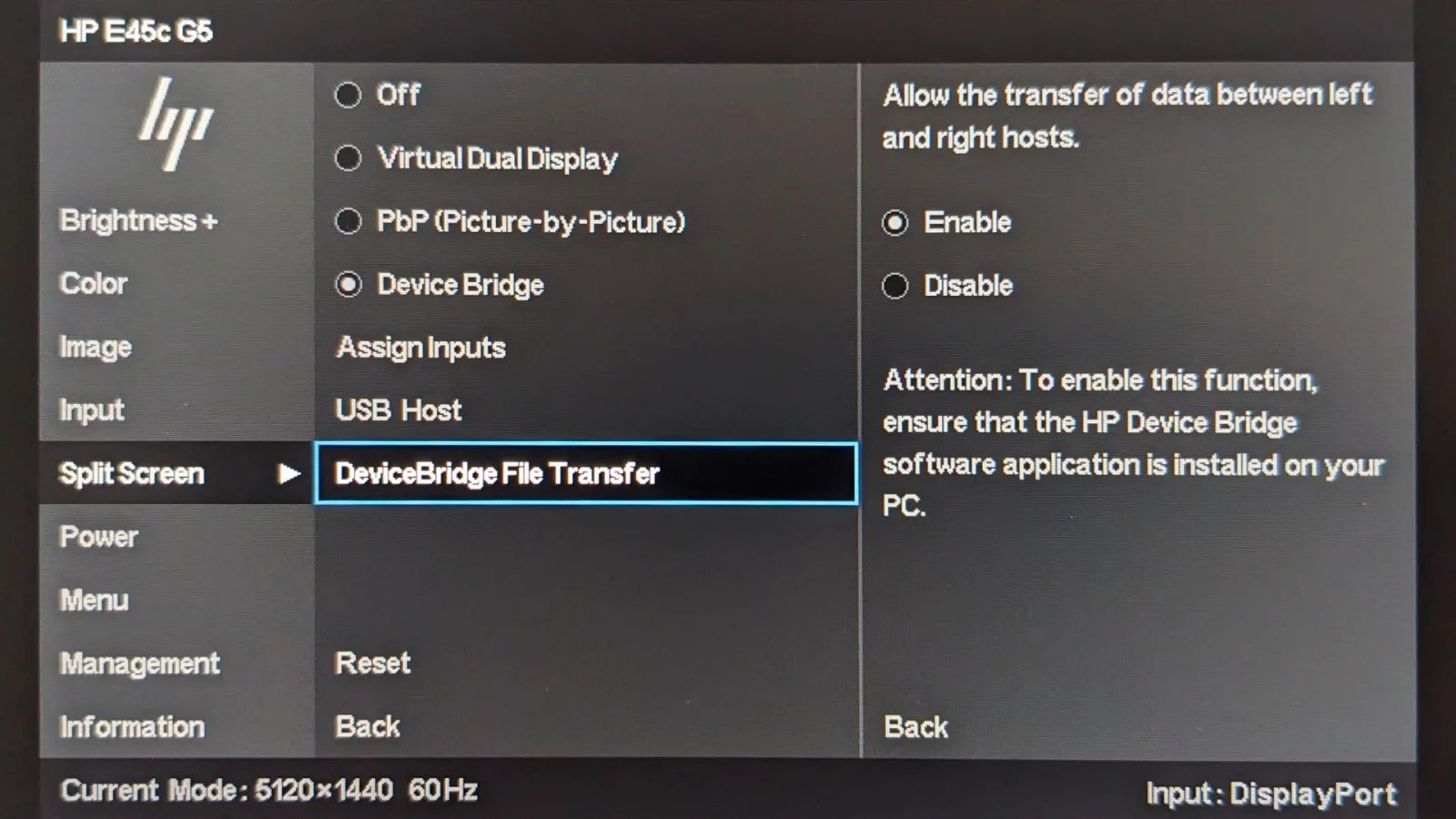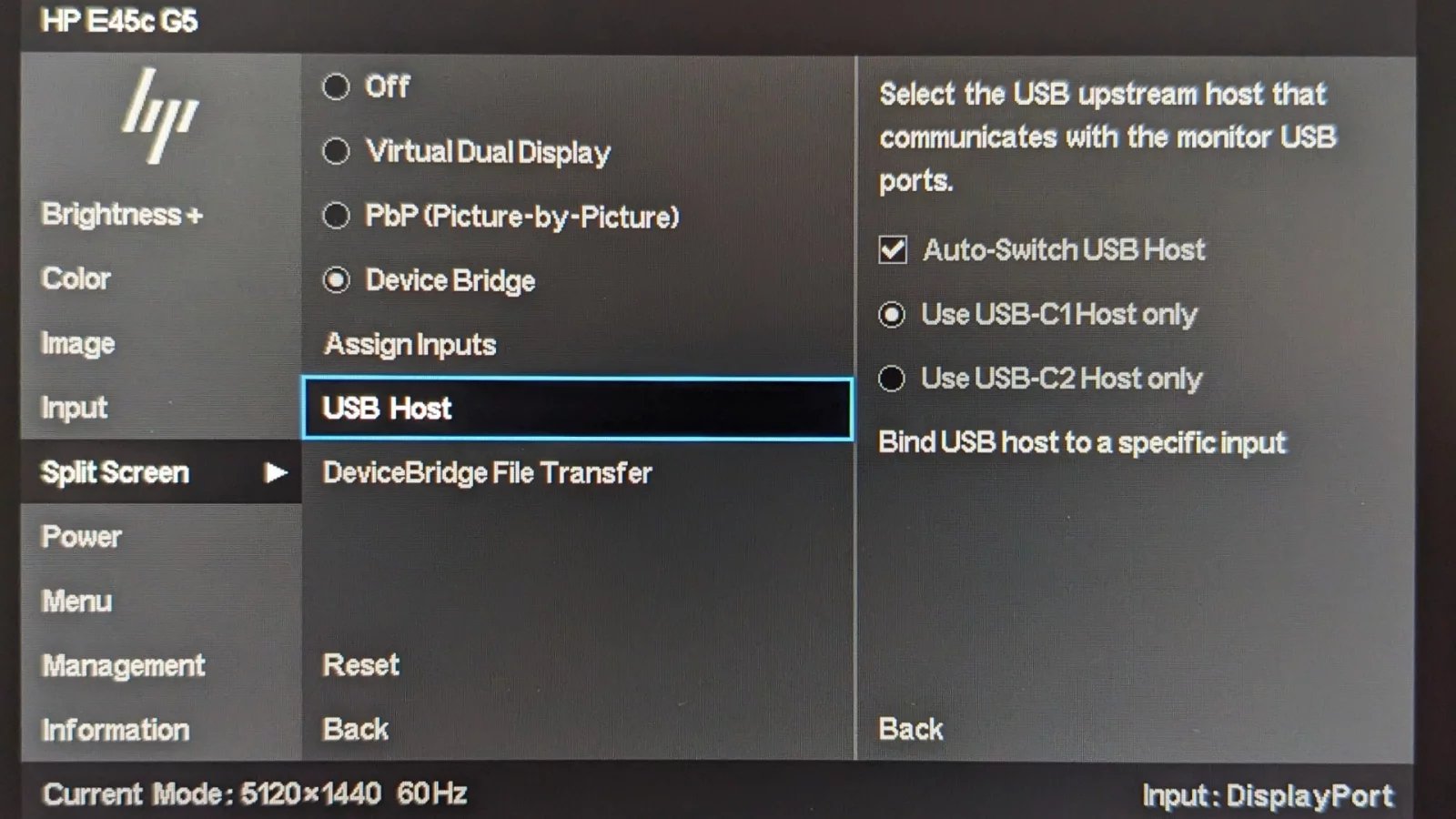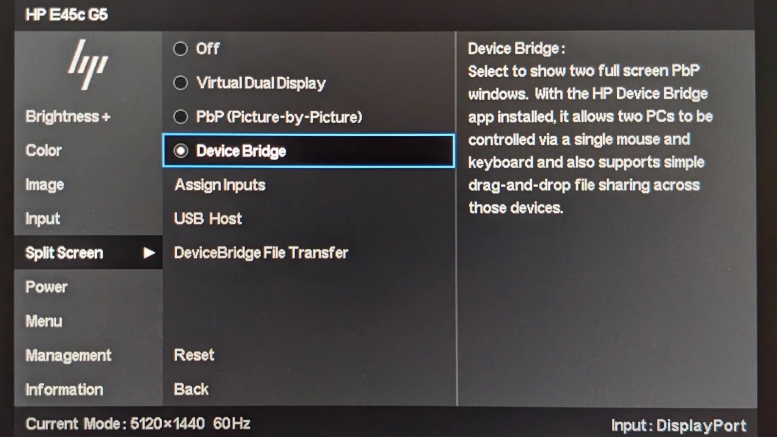 HP šlo u téhle funkce ještě dále. Pokud si na oba počítače nainstalujete prográmek HP Device Bridge, můžete používat myš i klávesnici (ty připojené k monitoru) na obou, respektive se mezi nimi přepínat. Funguje to pro Windows i macOS a lze takto kopírovat i data. Celé je to vlastně jako integrovaný KVM switch. Pokud byste se připojili přes DP či HDMI, bude potřeba zapojit ještě druhý USB kabel, aby fungoval i USB hub.