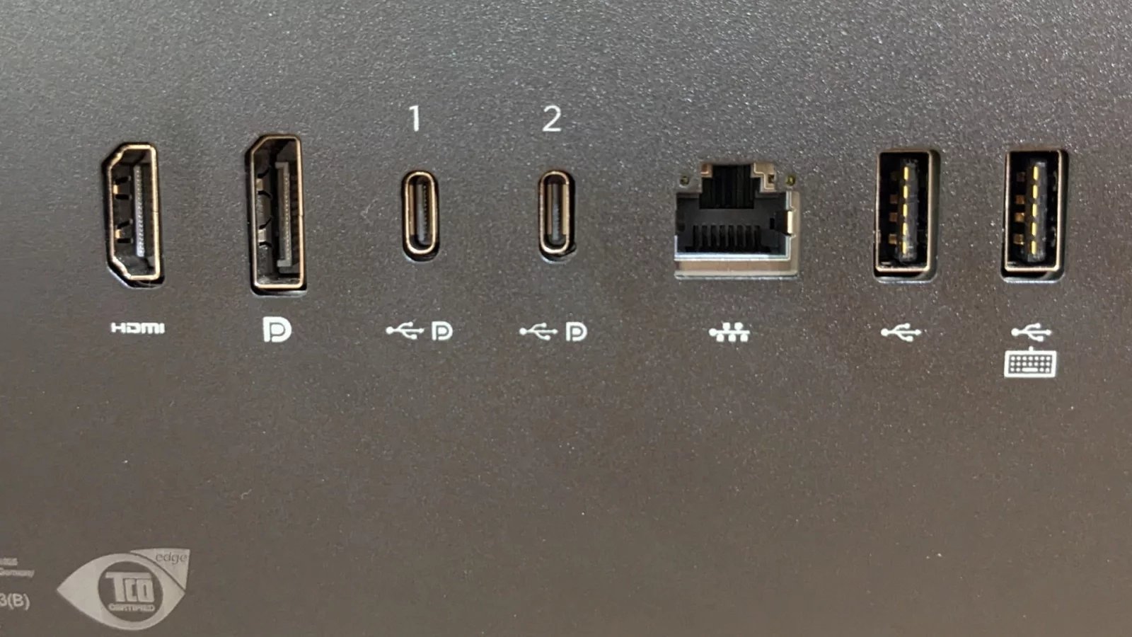 K počítači lze tento monitor připojit třemi způsoby. Pro notebook bude nejvhodnější USB-C (s podporou DisplayPortu), která tu jsou dokonce dvě. Stolní počítač zase přímo přes velký DisplayPort 1.4 a nesmí chybět ani univerzální HDMI standardu 2.1. Tím, že konektory, a potažmo kabely, míří dozadu, a ne dolů, je prostor za monitorem i pod ním takový uhlazenější.