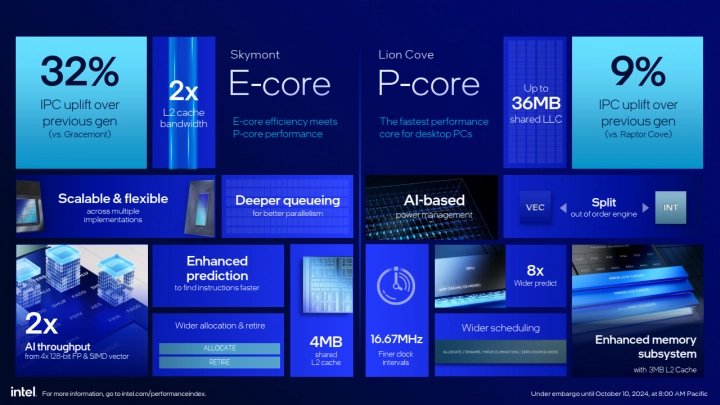 Procesory Intel Core Ultra 200S pro desktop. Výkon na 1 MHz frekvence stoupl u velkého jádra Lion Cove jen o 9 %, ale u malého jádra Skymont o až o 32 %