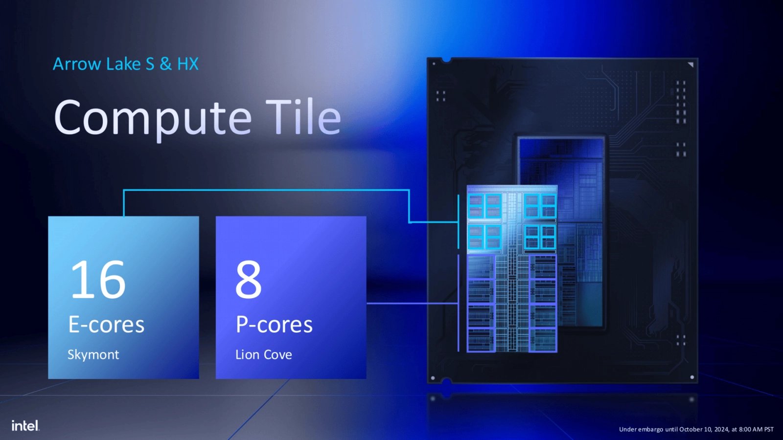 Procesory Core Ultra 200HX mají v plné konfiguraci 24 jader – osm jader P-Core s architekturou Lion Cove a 16 jader E-Core architektury Skymont s 36 MB L3 cache. Ty jsou v 3nm čipletu vyráběném TSMC. K tomu má procesor integrovanou grafiku s 512 shadery (4 Xe Core) architektury Xe LPG (jako v Meteor Lake), NPU s výkonem 13 TOPS a stejný multimediální engine jako desktopové procesory. Podrobněji jsme vlastnosti desktopových procesorů Arrow Lake-S, na kterých je Arrow Lake-HX založeno, probírali zde: