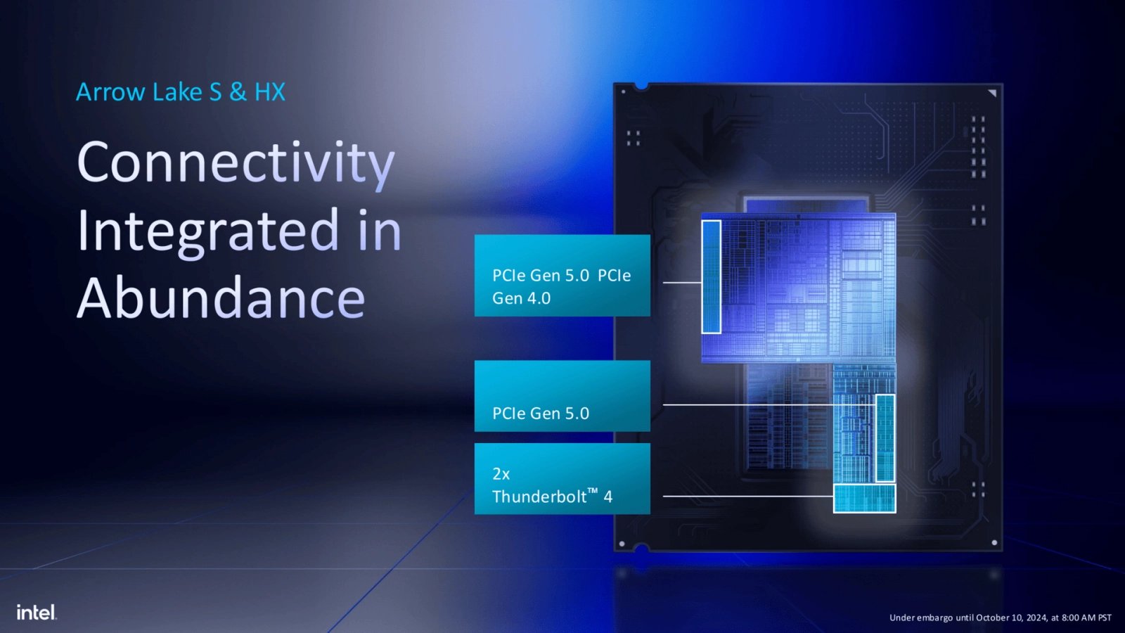 Konektivita zahrnuje řadič PCIe 5.0, integrovanou podporu Thunderboltu 4 v procesoru, DisplayPort 2.1 UHBR20 pro až 8K monitory a podporu pamětí DDR5–6400. Paměti LPDDR5X ani jiné paměti mobilního typu nejsou těmito procesory podporovány a procesor také – jako desktopová verze – stále potřebuje přídavný čipset řady 800 (s další konektivitou, včetně linek PCIe 4.0).