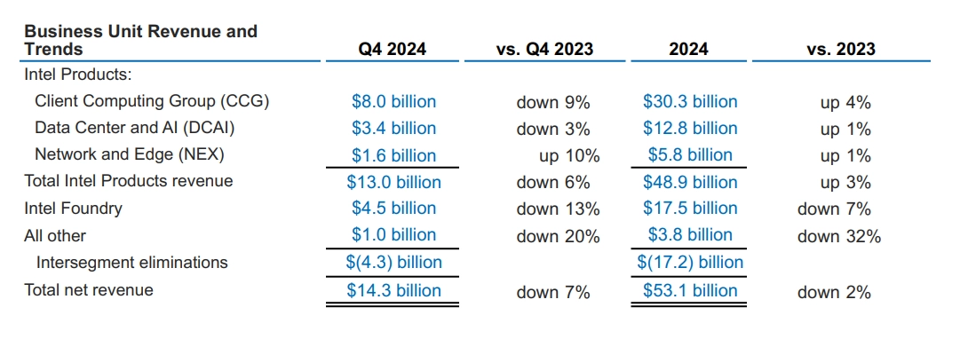 Nejvíce tržeb má Intel opět z PC (po době oficiální datacentrické strategie, kdy tvořila PC méně než polovinu). Divize Client Computing Group dodala v Q4 2024 celkem 8,017 miliard $ (9% meziroční pokles) a za celý rok 30,29 miliardy $ (nárůst o 4 %).