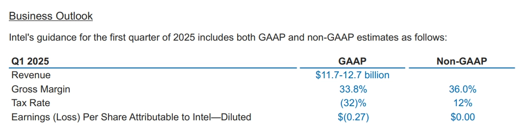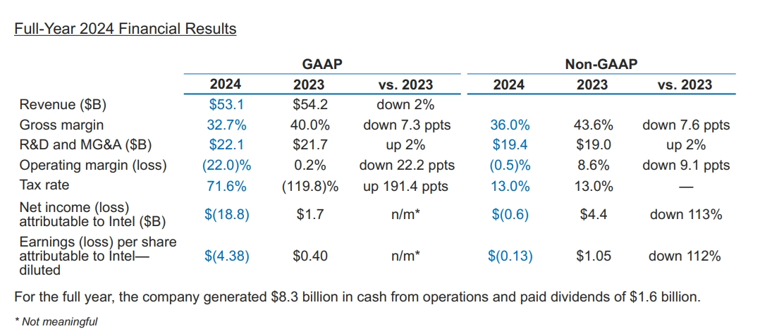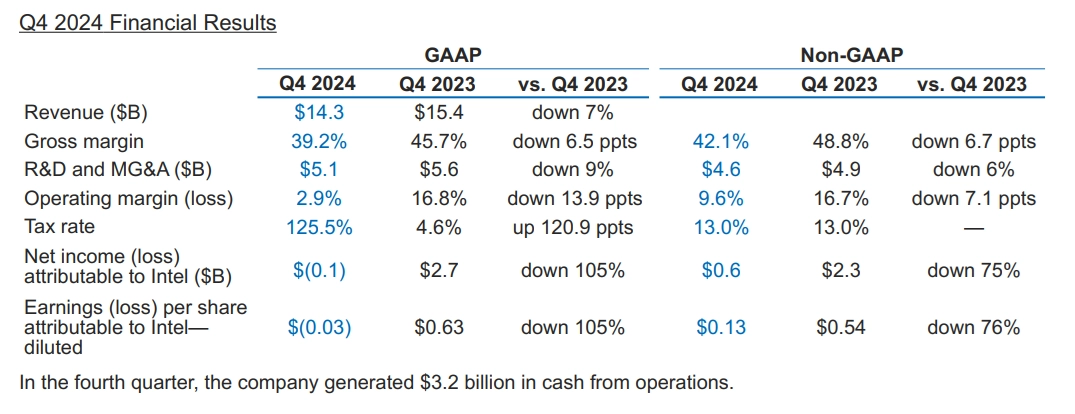 V non-GAAP účetnictví, které pomíjí některé transformační nebo jednorázové náklady, vychází sice čistý zisk 568 milionů $, non-GAAP údaje jsou ale jen informativní. Pro srovnání: před rokem v Q4 2023 měl Intel čistý zisk 2,669 miliardy $ při tržbách 15,406 miliardy $.