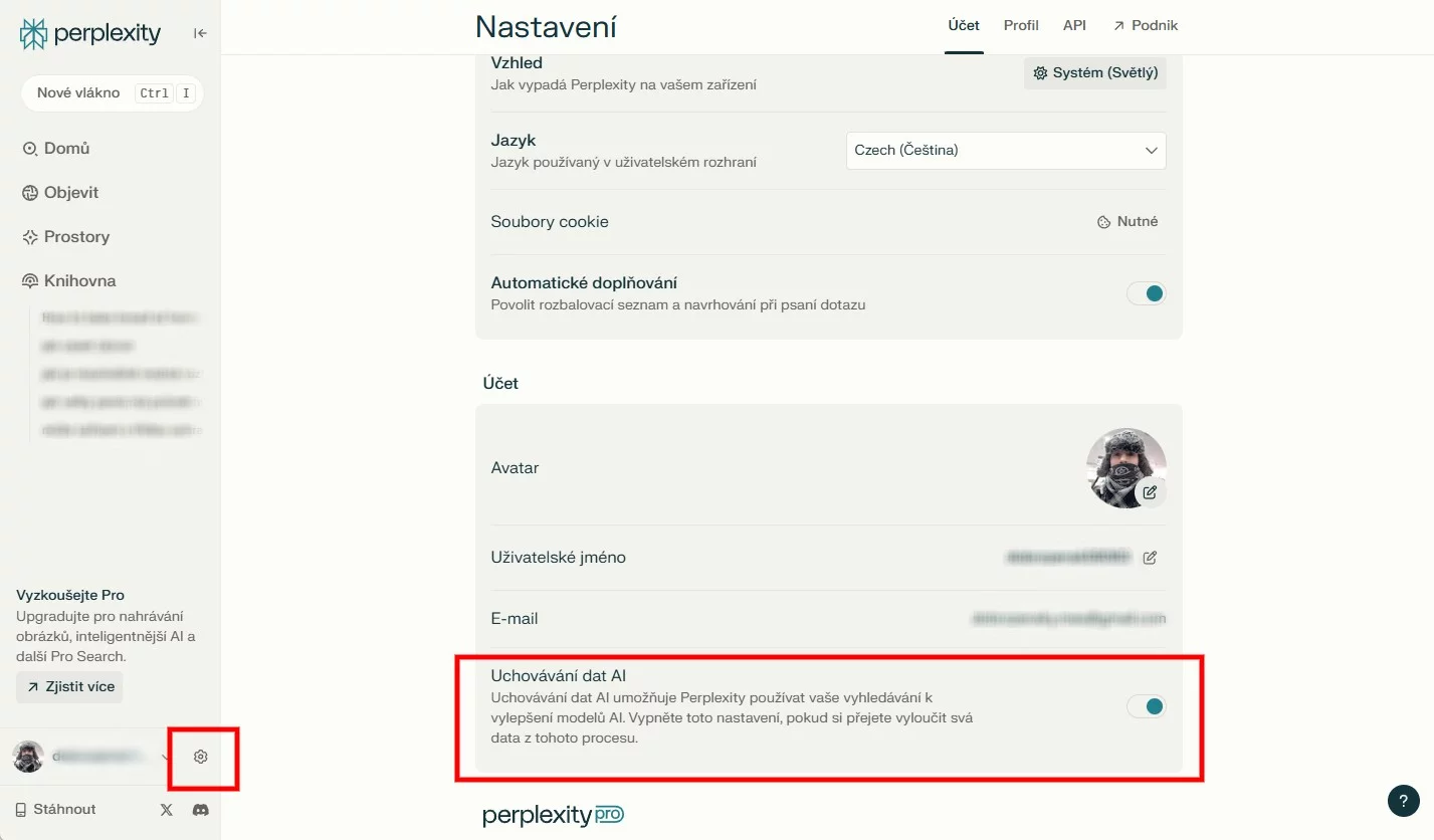 Zákaz používat uživatelská data k trénování umělé inteligence mohou učinit také uživatelé Perplexity. V rozhraní stačí přejít do Nastavení a deaktivovat položku Uchovávání dat AI.