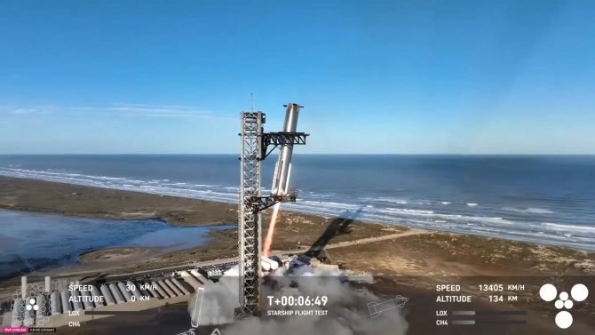 SpaceX úspěšně provedl svůj sedmý testovací let lodě Starship z Boca Chica v Texasu, během kterého dokázal podruhé zachytit posilovací stupeň Super Heavy pomocí ramen na startovací věži Mechazilla. Samotná kosmická loď nicméně po oddělení s prvním stupněm čelila problémům s několika motory, což vedlo ke ztrátě komunikace a následnému zničení.