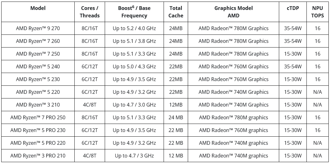 AMD během CES 2025 potvrdilo ještě další produkty pro notebooky, které už nejsou tak zajímavé, jde v podstatě o přeznačené starší procesory – 4nm APU Phoenix / Hawk Point a Phoenix 2 s architekturou Zen 4 a grafikou na bázi architektury RDNA 3, vydané v roce 2023 (jako Ryzen 7040 a 8040). Tyto modely budou v nových noteboocích označené jako Ryzen 200 a Ryzen Pro 200, což je tedy převedlo do „namespace“ používaného u nových Ryzenů AI po změně značení, v níž firma následovala Intel. Jen v tomto případě jde o pouze Ryzen (část modelů má nicméně starší méně výkonnou NPU s výkonem 16 TOPS).