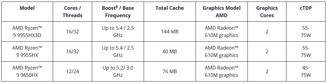 V základní řadě budou nabízené dva modely, které jsou v podstatě notebookovou verzí desktopových Ryzenů 9 9900X a 9950X, ovšem s nižší spotřebou – tato notebooková řada má 55W výchozí TDP. Dá se volitelně nastavit v rozsahu 55–75 W (bohužel nemáme informaci o maximální boostové spotřebě, tzv. PPT). Nejvýkonnější Ryzen 9 9955HX poskytuje 16 jader Zen 5 s 32 vlákny a 64MB L3 cache, a je tak obdobou Ryzenu 9 9950X. Jeho základní takt je kvůli TDP snížený na 2,5 GHz, maximální boost má pak o 300 MHz nižší než model 9950X, což je asi kvůli snížení příkonu v nízkých a jednovláknový zátěžích.