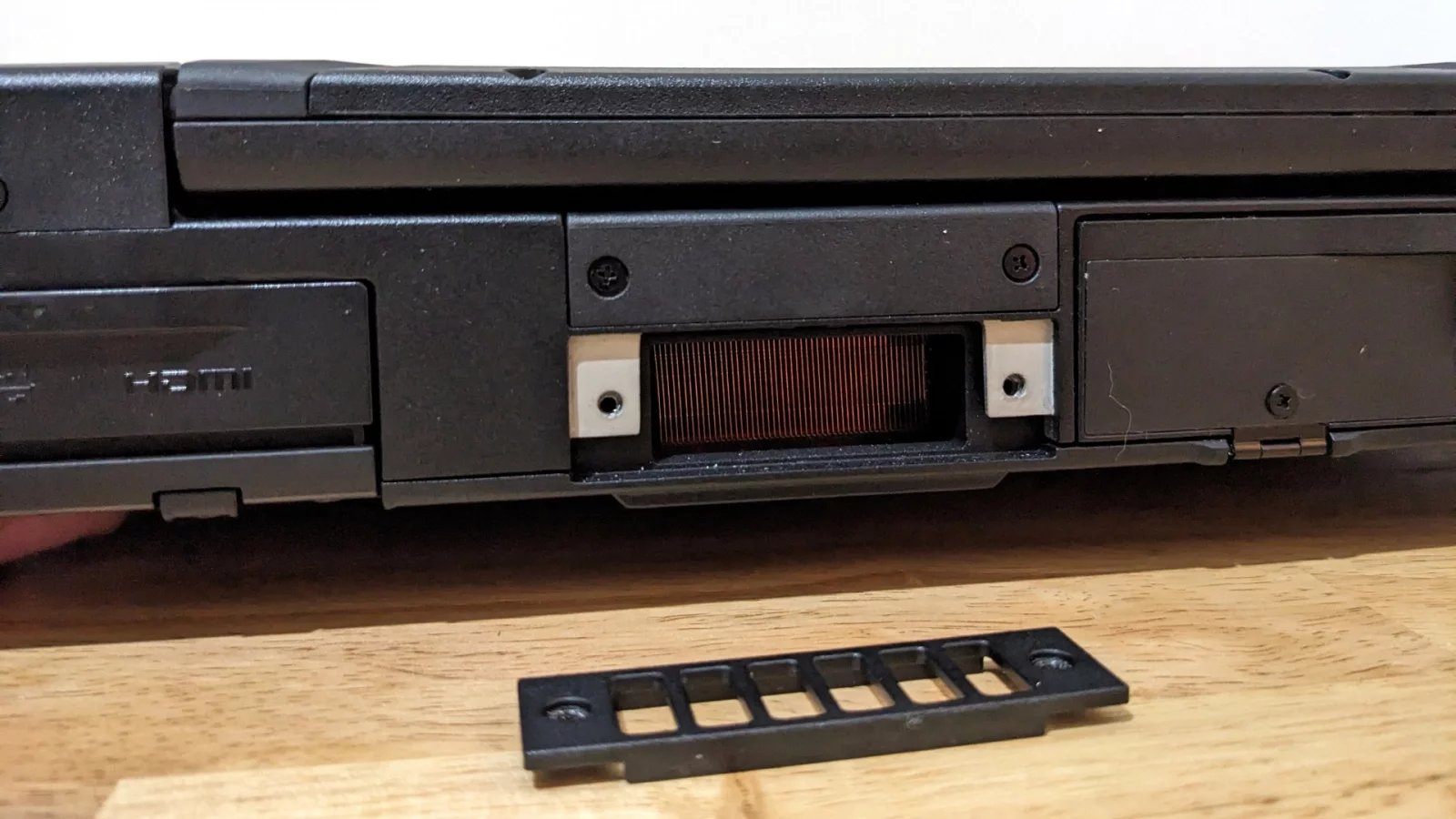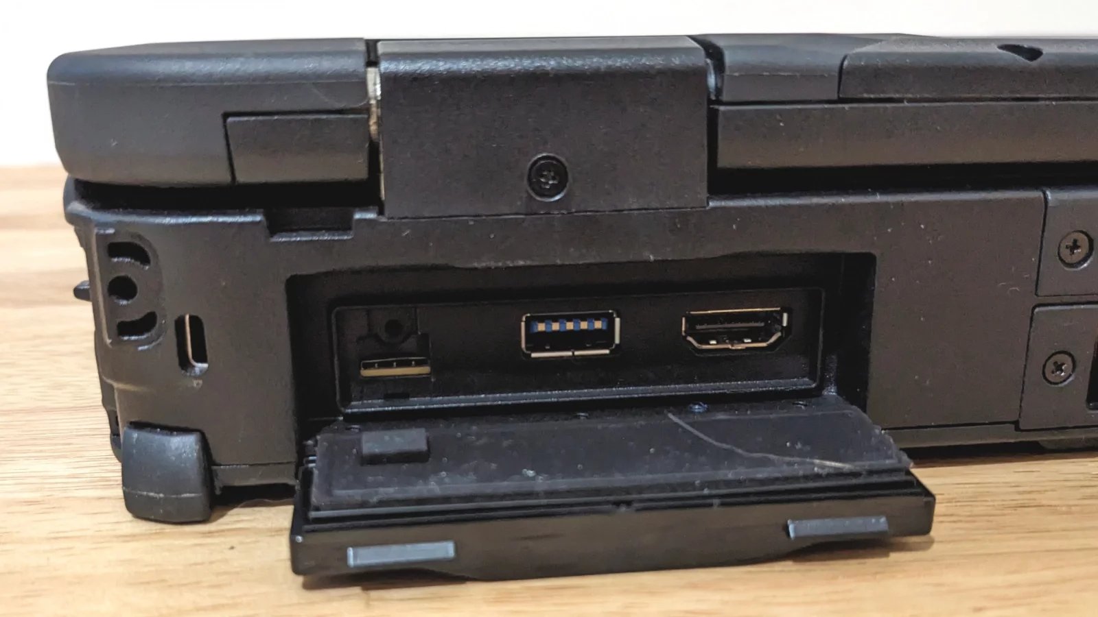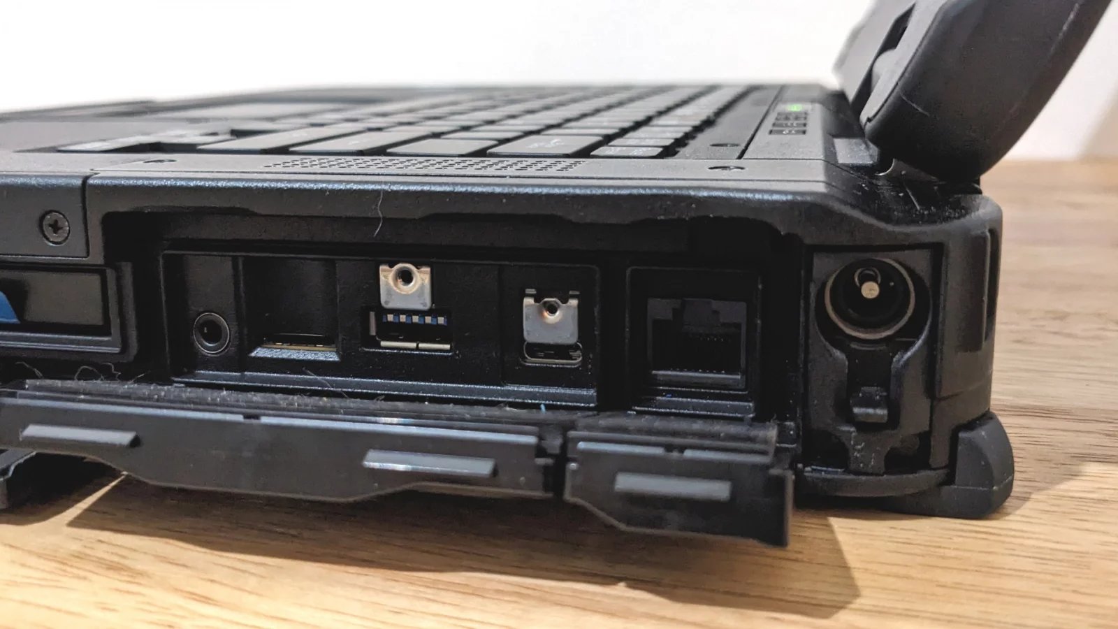 A protože v této části je uvnitř notebooku základní deska, najdete zde pod dalšími dvířky i sadu několika portů: jack, slot na microSD, USB-A 3.2 a USB-C (10 Gb/s | 1000 MB/s). Další samostatná dvířka mají drátová síť RJ45 a napájecí kolík (ten má úplně jiný typ dvířek, vysouvají se nahoru).