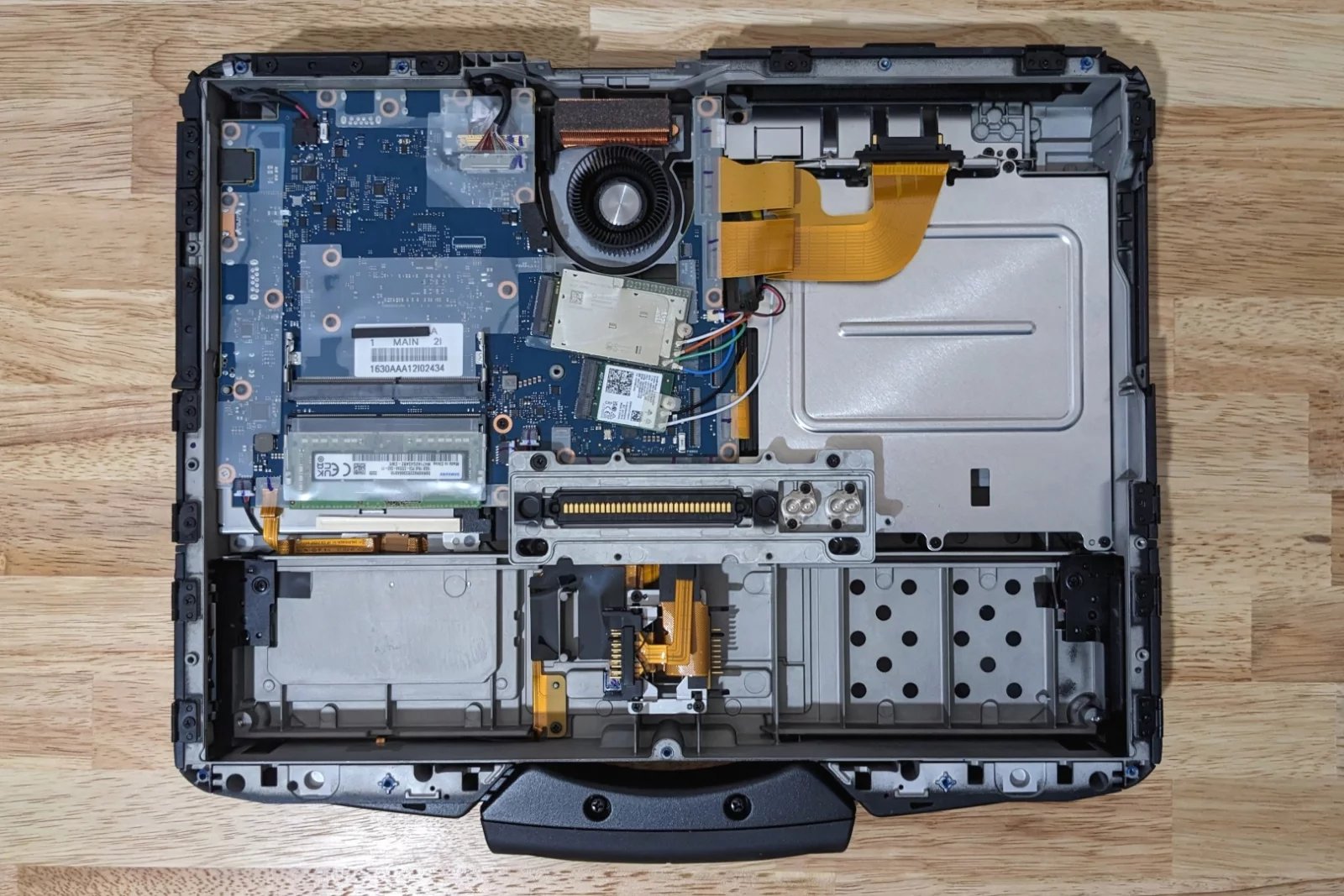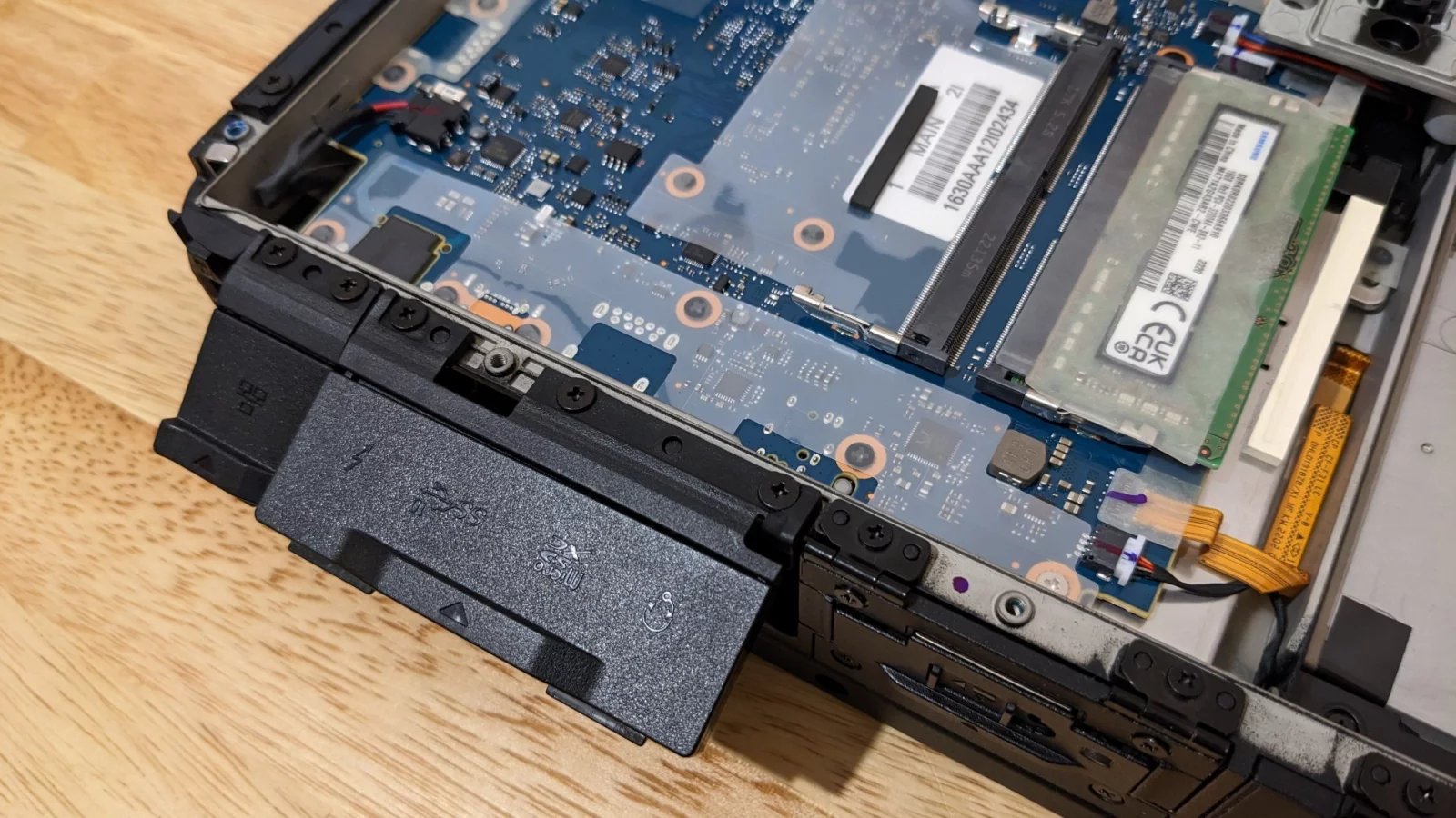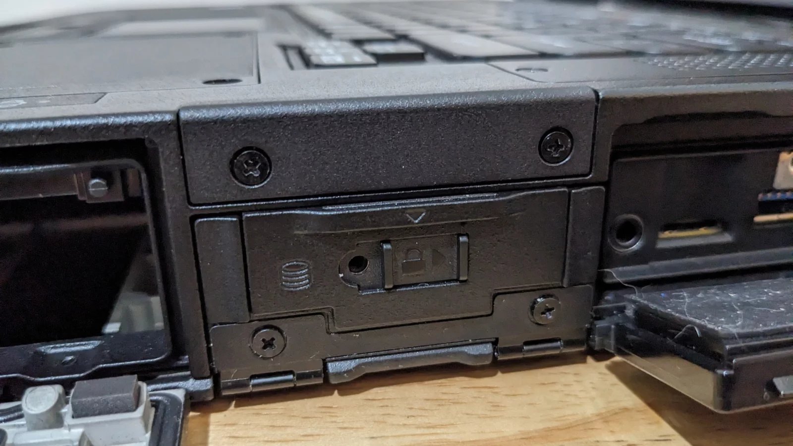 Taktéž SSD disk se mění pomocí zásuvného modulu na boku. Disk je umístěn v odolném pouzdře. Zkusmo jsem jej rozšrouboval – uvnitř je SSD standardního rozměru 2280 o kapacitě 512 GB od Samsungu pro rozhraní PCIe 3.0 x4 (označení výrobce na disku vidět není, ale jde o model PM991a). Zde tedy nejde o žádného rychlíka – udávané rychlosti dosahují 3100/1800 MB/s.