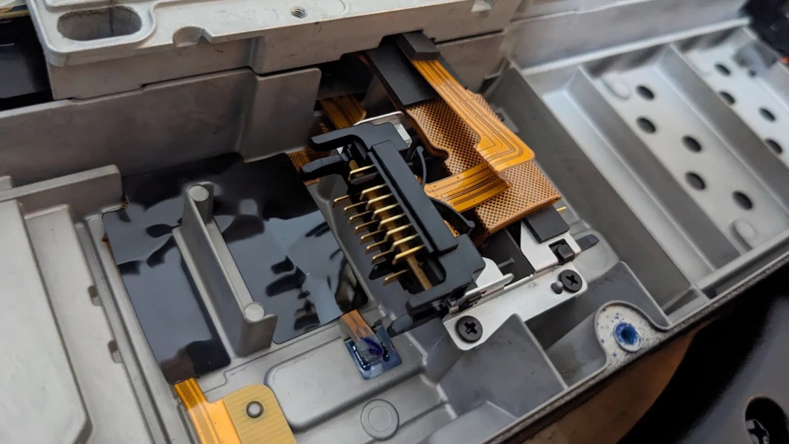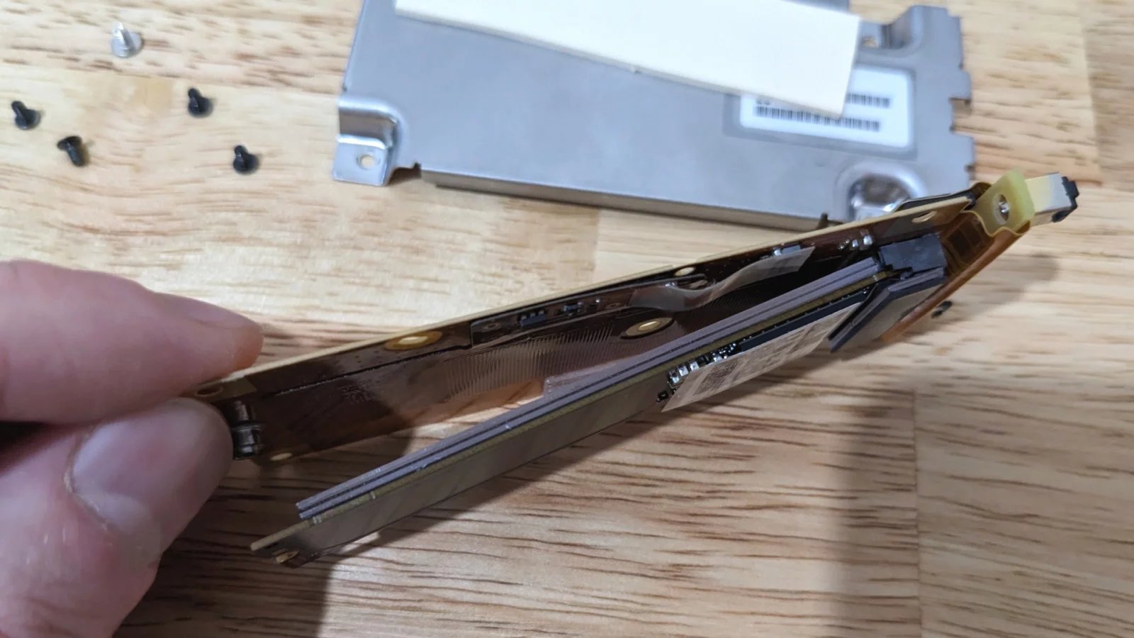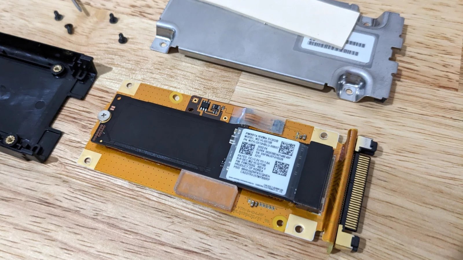 Taktéž SSD disk se mění pomocí zásuvného modulu na boku. Disk je umístěn v odolném pouzdře. Zkusmo jsem jej rozšrouboval – uvnitř je SSD standardního rozměru 2280 o kapacitě 512 GB od Samsungu pro rozhraní PCIe 3.0 x4 (označení výrobce na disku vidět není, ale jde o model PM991a). Zde tedy nejde o žádného rychlíka – udávané rychlosti dosahují 3100/1800 MB/s.