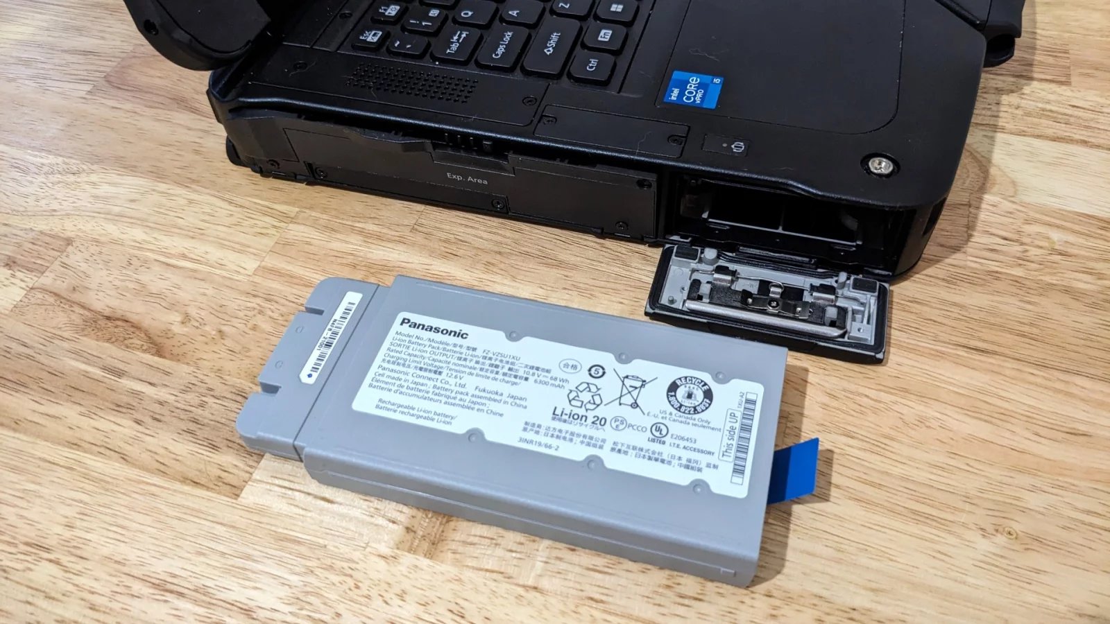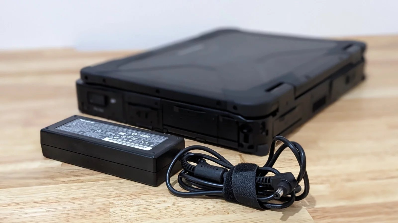 V notebooku je místo pro dvě baterie, v testovaném kusu byla jedna (typ FZ-VZSU1K). Osazený adaptér má kapacitu 68 Wh a do Toughbooku se z druhé strany vejde ještě jeden takový. Napájecí adaptér poskytuje 110 W. Notebook lze nouzově nabíjet i přes USB-C, ale je potřeba silnější adaptér, z klasické smartphonové nabíječky to spíše nepůjde.