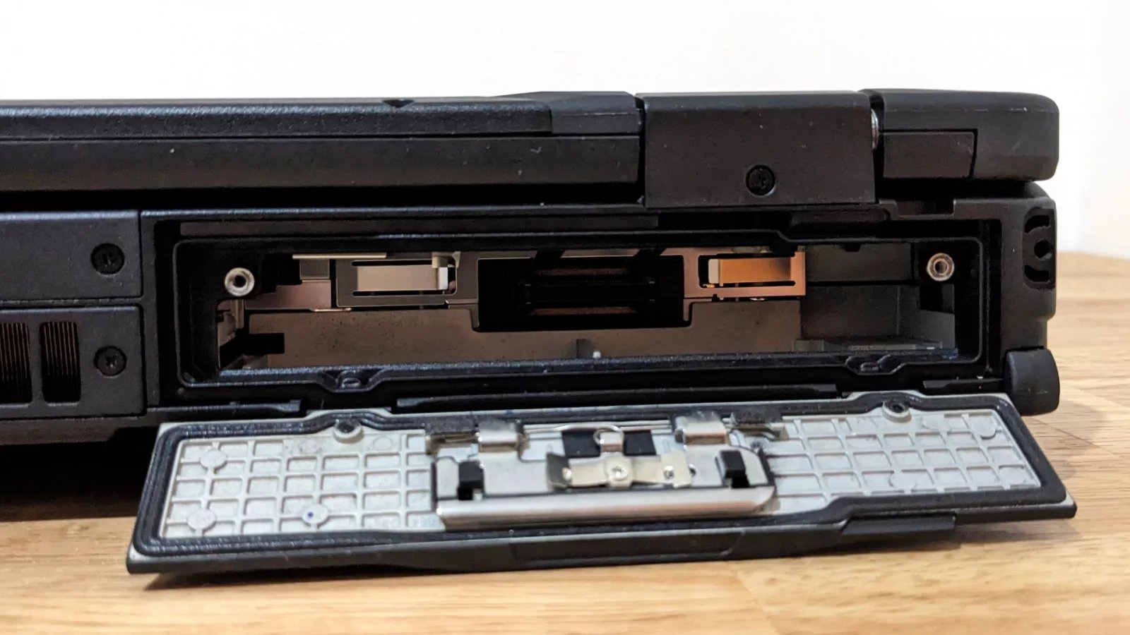 Na levé straně je místo pro optickou mechaniku (není v základu), kdy můžete vybírat mezi CD, DVD i Blu-ray. Pod dvířky je i plastová pojistka proti zasunutí/vysunutí média. Kromě mechaniky zde může být druhé SSD (typu SATA). Vedle je potom slot pro primární akumulátor.