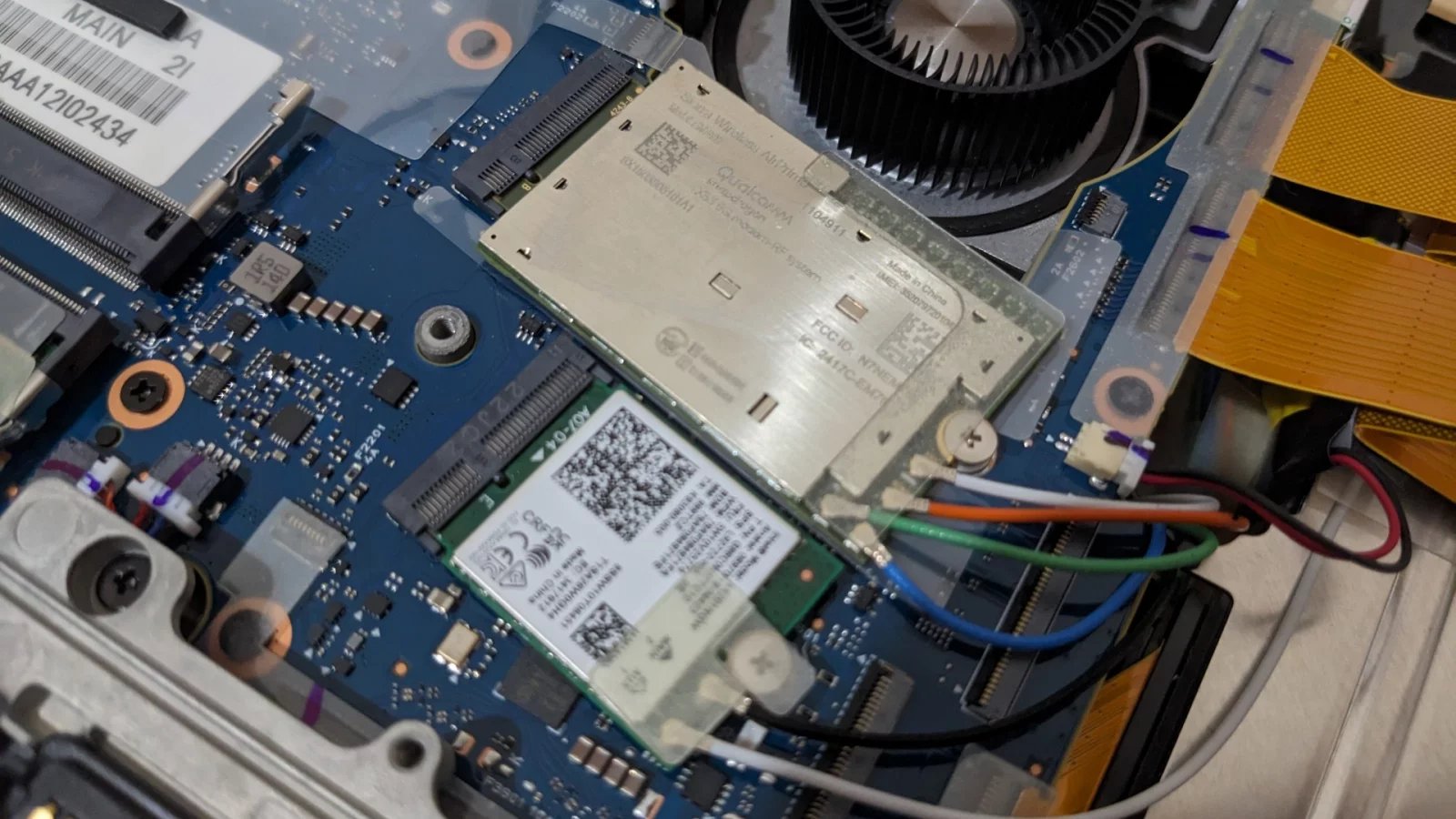Přístupné jsou pak ještě moduly pro bezdrátové sítě. Velký plech na straně pouze kryje případnou optickou mechaniku. Místo ní lze osadit druhé SSD, ovšem jen pomalejšího standardu SATA (u notebooků je to běžné).