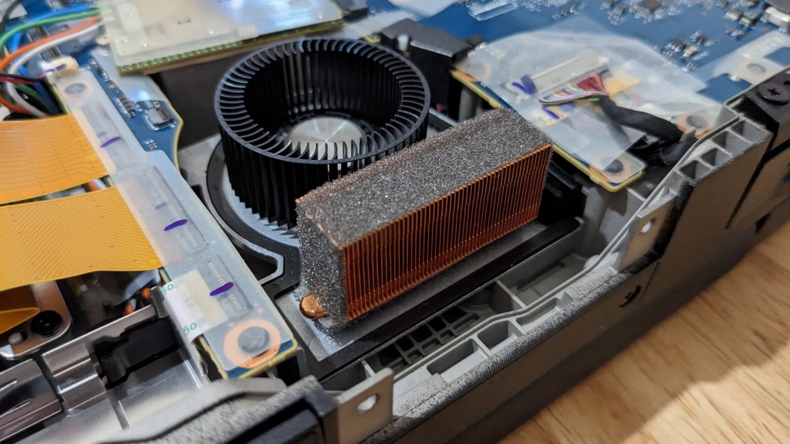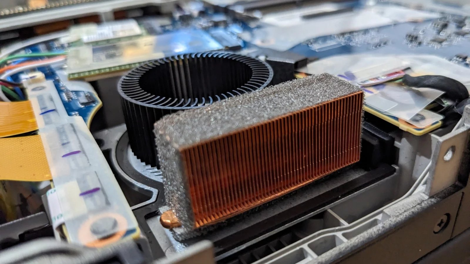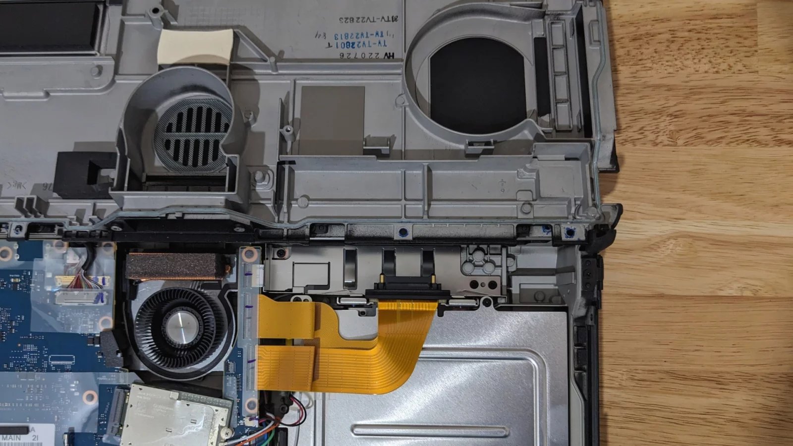Pokud sundáte celý spodní kryt (který je mimochodem z velmi pevného, ale současně tenkého a lehkého kovu), můžete si prohlédnout celé vnitřnosti. Z chlazení je vidět jen malá část – ventilátor nasávající vzduch zespod a foukající jej přes vysoký pasiv směrem dozadu. Pod samostatnými malými krytkami je i možnost vyčištění průduchů chlazení.