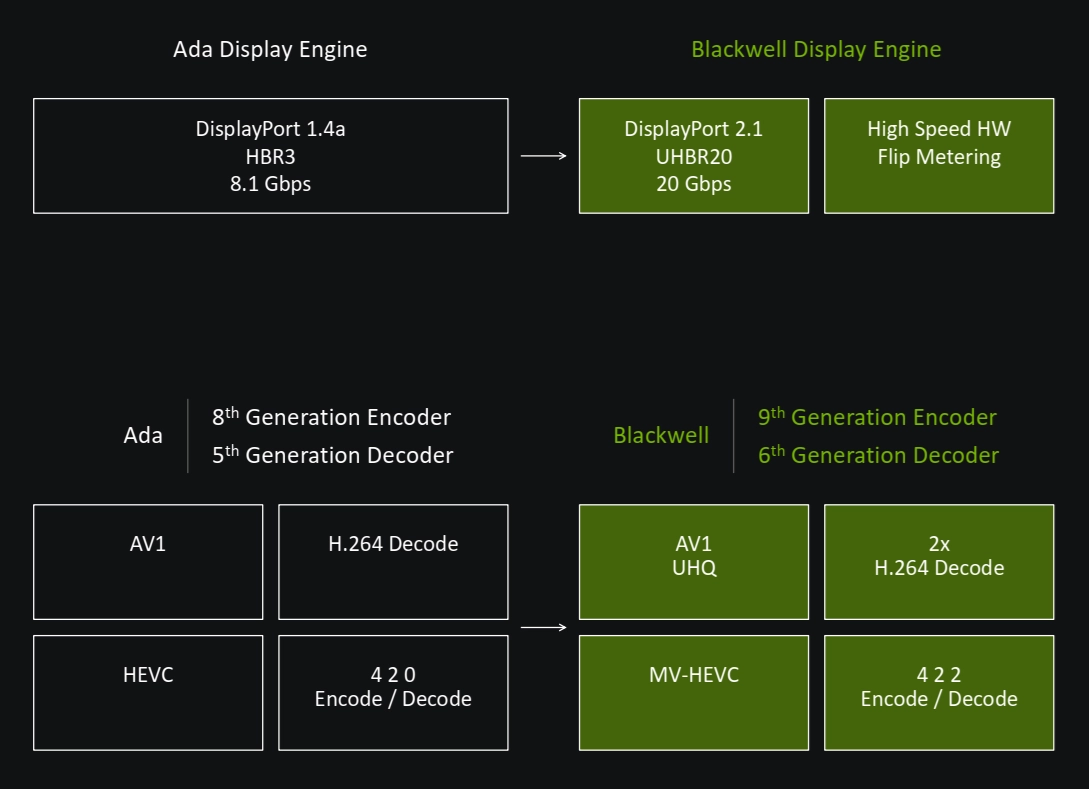 Blackwell také splácí další dluh, respektive přináší věc, která se čekala už od předchozí generace, ale podporována nebyla, a sice konečně podporu DisplayPortu 2.0/2.1 pro připojení monitorů s vyšším rozlišením a obnovovací frekvencí. Či alternativně s nižší úrovní ztrátové komprese, která je dnes u monitorů používána. V tomto případě šlo na rozdíl od PCIe 5.0 o větší dluh, protože DisplayPort 2.1 už byl podporován některými grafikami předchozí generace – Radeony RX 7000 a kartami Intel Arc generace Alchemist (novější generací Battlemage také).