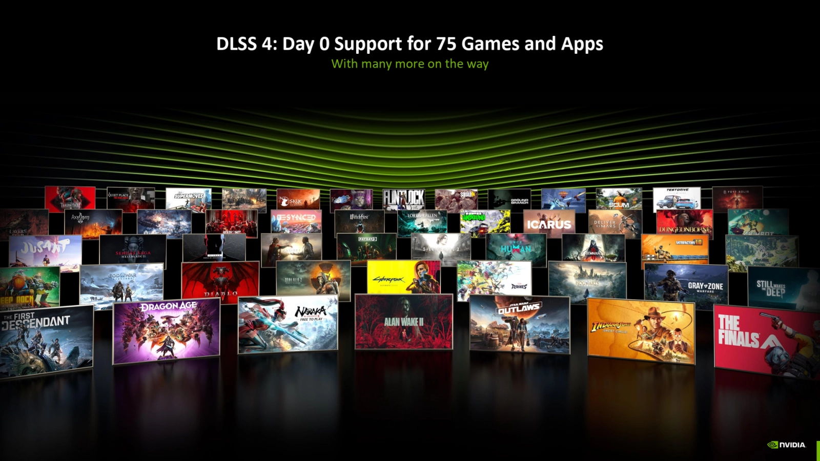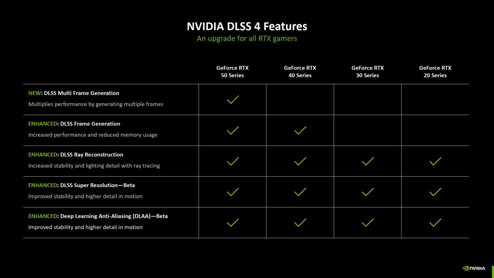 Nicméně mnohosnímkové interpolování je omezeno jen na nové karty RTX 5000. A to paradoxně přesto, že nepoužívá nějaké speciální hardwarové jednotky. Toto je překvapení, protože interpolace snímků v předchozím DLSS 3 je naopak závislá na hardwarových jednotkách v čipech Ada Lovelace. DLSS 4 od nich ale upustilo a používá jen tensor jádra, je tedy v určitém smyslu softwarové (v rámci toho, že jde stále o neuronovou síť běžící na hardwarových akcelerátorech). Jejich výkon je v nové generaci vyšší, ale i tak – když už má multisnímkové generování fungovat třeba na RTX 5070 nebo budoucích RTX 5060, pak by minimálně ve vyšších modelech předchozích generací snad mělo být výkonu tensor jader také dost. Nvidia už připustila, že by teoreticky ještě podpora starším grafikám mohla být přidána, ale zatím není nic přislíbeno.