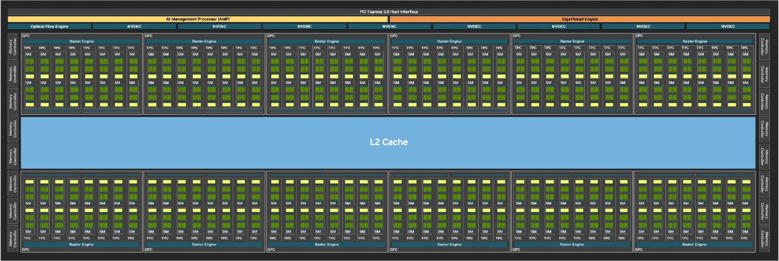 V tomto případě je menší plocha čipu ale způsobená tím, že GB205 má slabší parametry. Zatímco AD104 obsahuje 60 bloků SM, čip GB205 má jen 50 SM (5 GPC, 25 TPC), což je v plné konfiguraci 6400 shaderů, 50 RT jader a 200 tensor jader – RTX 5070 ale bude mít osekanou konfiguraci s jen 6144 shadery, bude se v ní tedy dát upotřebit i čip s nějakým defektem.