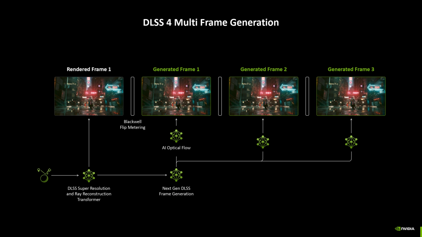 Novinka v DLSS 4 je tzv. „Multi Frame Generation“, což není nic jiného, než že se nyní mezi reálné snímky vkládá více umělých dointerpolovaných. Mohou to být dva snímky (66 % „umělých snímků ve výsledném výstupu“, teoreticky 3× FPS proti reálné frekvenci hry), nebo tři snímky, což znamená, že 75 % snímků, které uvidíte, je uměle dointerpolovaných (což znamená potenciálně horší kvalitu) a jen 25 % reálných. Můžete ale teoreticky mít 4× vyšší koncové FPS, než hra a GPU reálně vykreslují.