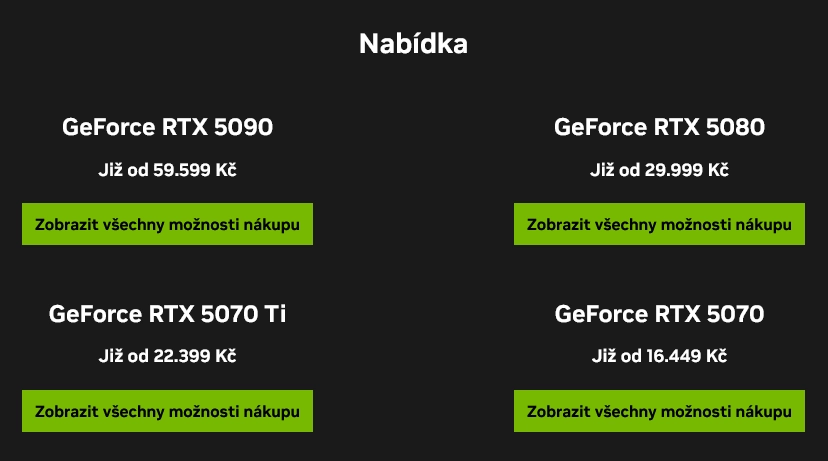 Podívali jsme se, zda se s tímto nezměnily i oficiální ceny pro Českou republiku, protože kurz koruny k euru je v podstatě dlouhodobě stabilní okolo 25 Kč, a tudíž česká měna pohyb eura k dolaru vesměs kopíruje. Bohužel se zdá, že pro nás doporučené ceny sníženy nebyly a jsou stejné jako při vydání. Tedy 59 599 Kč za RTX 5090, 29 999 Kč za RTX 5080, 22 399 Kč za RTX 5070 Ti a 16 449 Kč za RTX 5070.