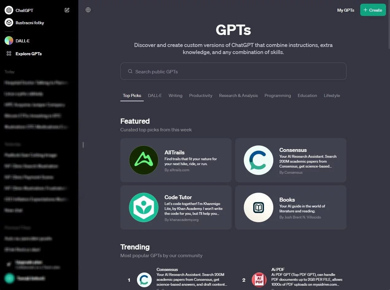 GPT Store (nebo také GPTs) lze už nyní nalézt v levé liště rozhraní pod DALL-E, nástrojem pro generování obrázků. Aktuálně je v GPT Store k dispozici celá řada verzí, které jsou prozatím zdarma (do budoucna ale mohou být zpoplatněny).