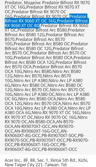 Jako poměrně často se indicie k této nové grafice objevily v databázi EEC, do níž Acer zadal jména svých plánovaných karet. Jde o různé modely v provedeních Predator Bifrost a Nitro (toto označení firma také používá, neplést s kartami Sapphire): Radeon RX 9070 XT, Radeon RX 9070 a už také Radeon RX 9060 XT.