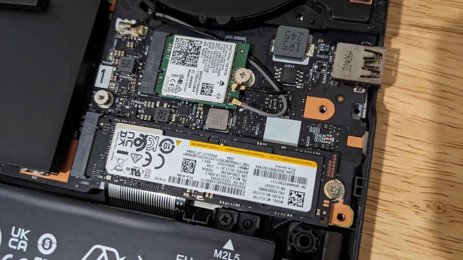Pod dalším plechem uprostřed (který lze snadno odcvaknout) najdete dva paměťové moduly LPDDR5 a po stranách (opět pod plíšky) pak dva sloty pro SSD standardní velikosti 2280. Jeden z nich je osazen v mém případě terabajtovým diskem od Samsungu.