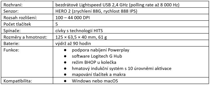 Myš je dostupná pouze v černo-bílém provedení – bílé tělo doplňují černá tlačítka. Dobré ergonomii pomáhá i nízká hmotnost 61 gramů, díky které je myš v ruce hezky obratná. Na jejím těle najdete celkem 5 tlačítek, přičemž dvě z nich využívají nové HITS cívky, k nim se dostaneme později. Osobně mi chybí samostatné tlačítko pro změnu DPI, protože změna je nutná řešit přes software Logitech G Hub.