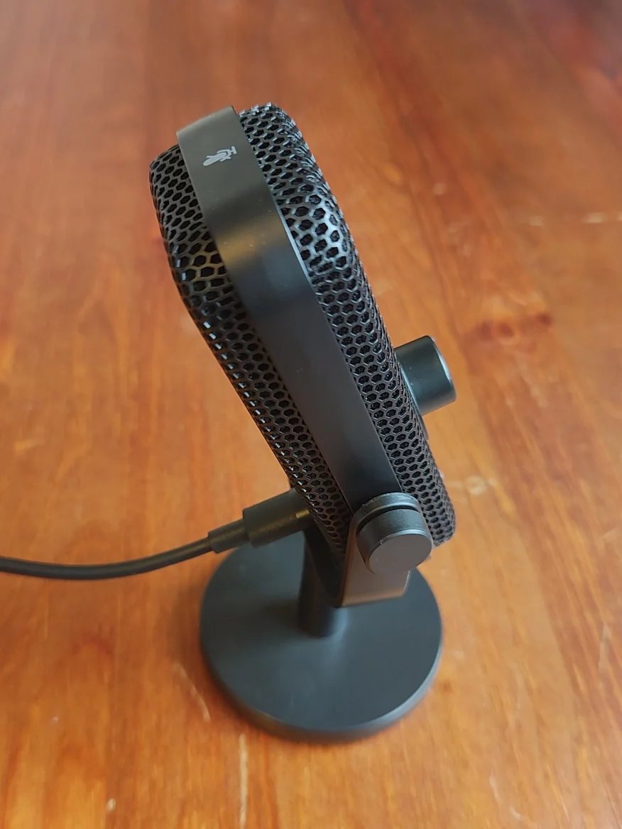 Endorfy Solum Vioce S vypadá na první pohled jako klasický mikrofon na stojánku, přesto však nabízí pár vychytávek, na které se stojí za to podívat. Kovové tělo připomínající včelí plástev je po bocích obehnáno plastovým rámem, z přední strany pak nejvíce zaujme otočné kolečko pro regulaci hlasitosti mikrofonu doprovázené logem Endorfy ve spodní části.