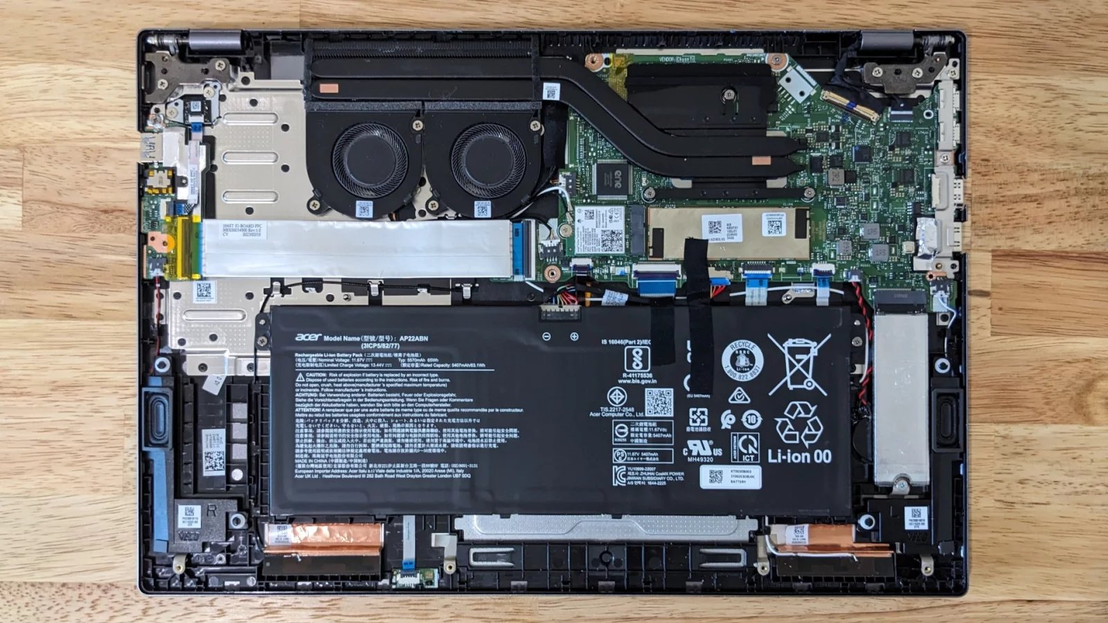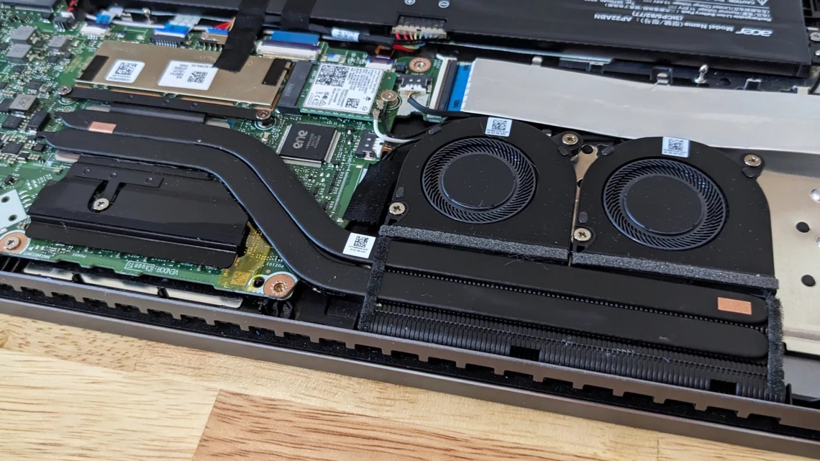 Pod krytem uvidíte zmíněný TwinAir, což je marketingový název použitého chlazení. To se skládá ze dvou heatpipe a dvou ventilátorů, které se podílejí na vyfukování horkého vzduchu od jednoho zdroje tepla – procesoru. Nasávání vzduchu vede částečně spodem a částečně přes klávesnici. Vyfukování potom míří na displej v jeho pravé části.