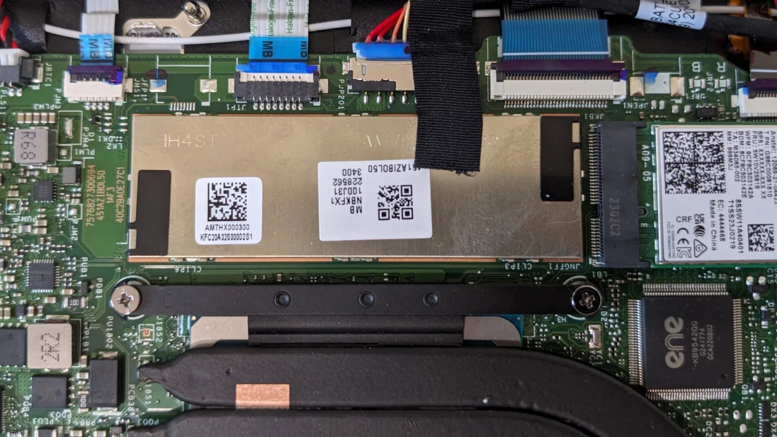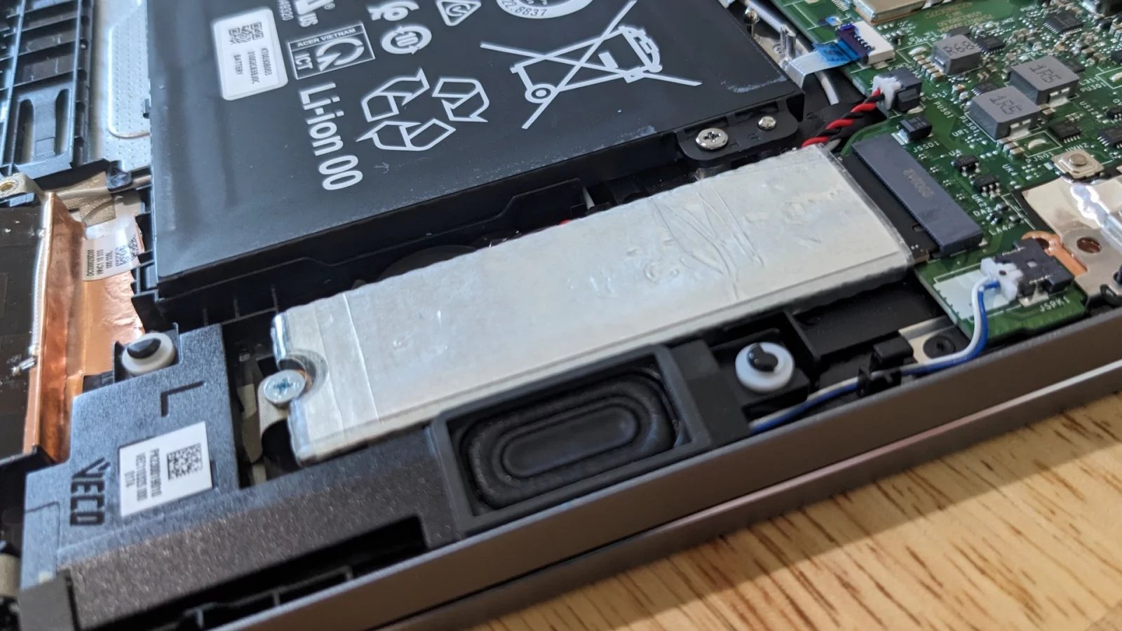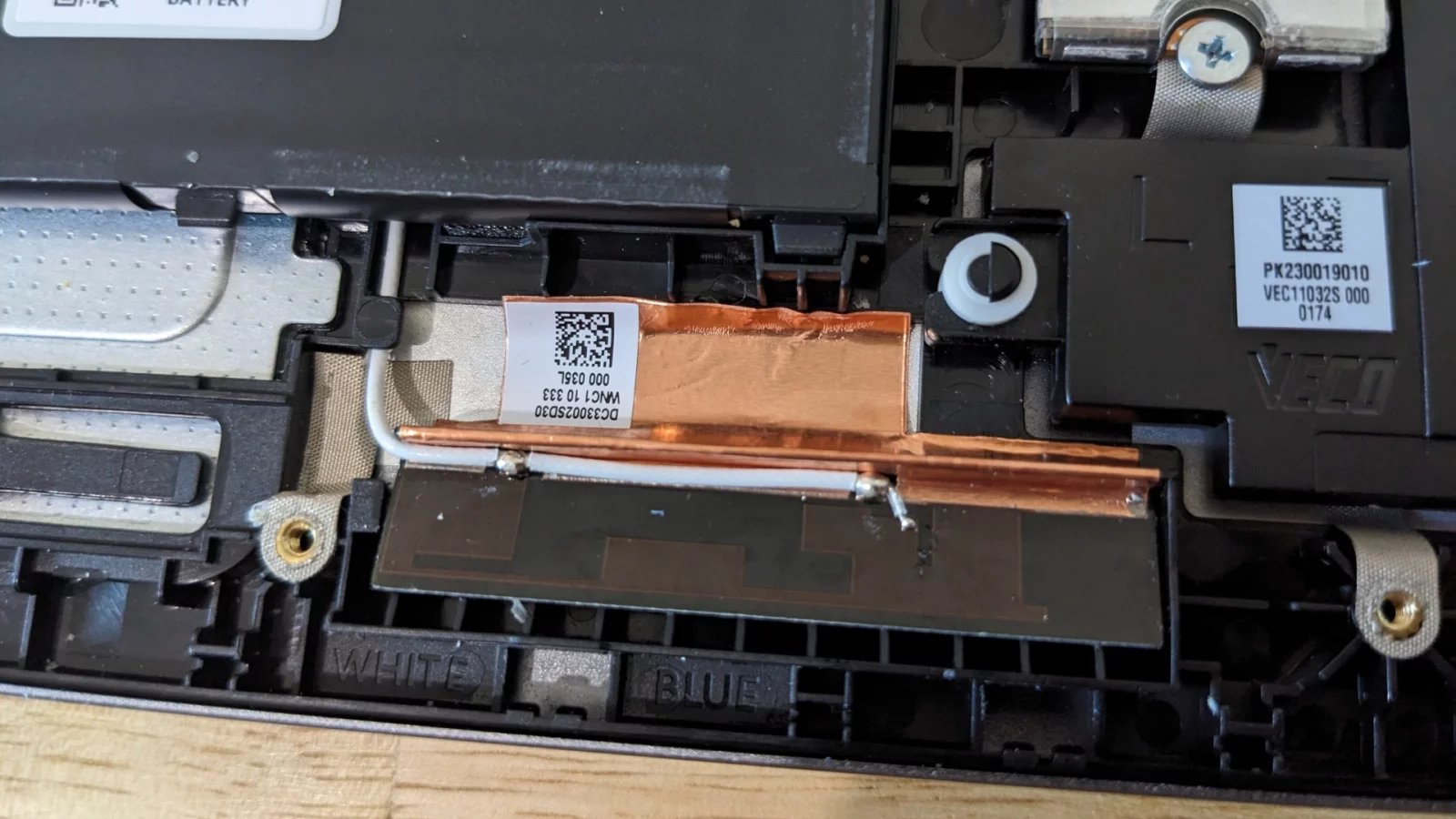 Uživatelsky přístupný je kromě SSD i modul pro bezdrátové sítě. Kablíky od něj vedou ke dvěma výrazným zářičům (měděné plíšky) v prostoru pod akumulátorem. Na opačné straně baterie je potom nevyužitý volný prostor.
