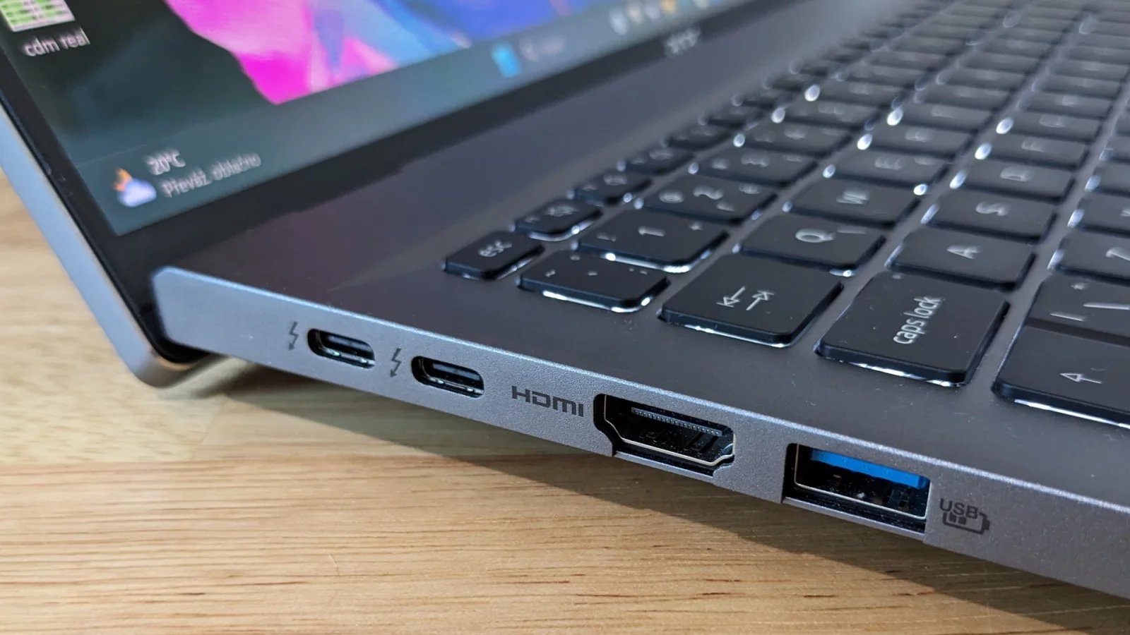 Ke Swiftu není problém připojit skoro cokoliv. Dva plnotučné porty USB-C nabízejí podporu Thunderbolt 4 i DisplayPortu, zároveň umí nabíjet výkonem až 100 W (Power Delivery). Když jsem použil náhodný čínský USB-C kabel, začal se dost přehřívat (ten kabel), ale ten v balení od Aceru to zvládl plným výkonem.
